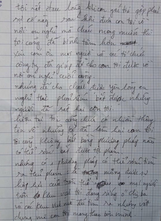 Nhưng để được cháu yên lòng an nghỉ thì phải sớm bắt được những người đã sát hại con tôi. Hiện tại, tôi cũng không có nhiều thông tin về những kẻ đã hại con tôi. Tôi cũng không biết bằng phương pháp nào sớm bắt được tội phạm.