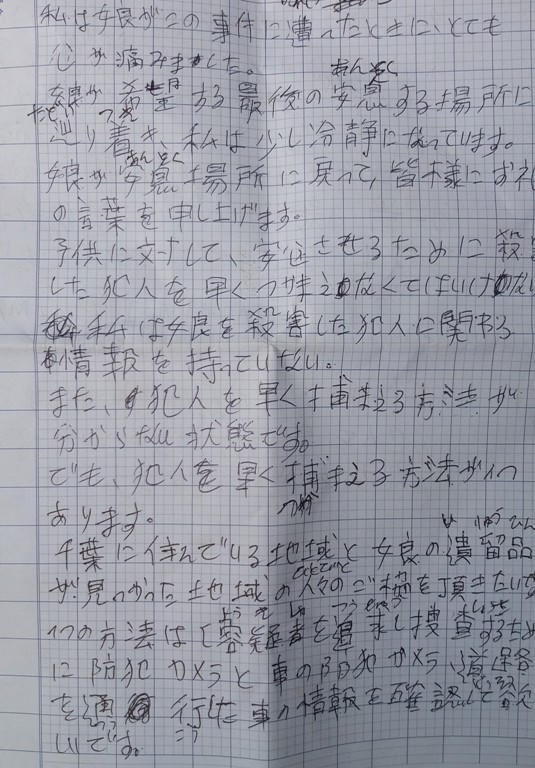 Nhưng có thể có một phương pháp sớm tìm ra tội phạm là mong được sự hợp lực của toàn thể mọi người trên khu vực tôi đang sống tỉnh Chiba và những khu vực mà đã tìm ra những vật dụng con tôi mang theo bên mình.