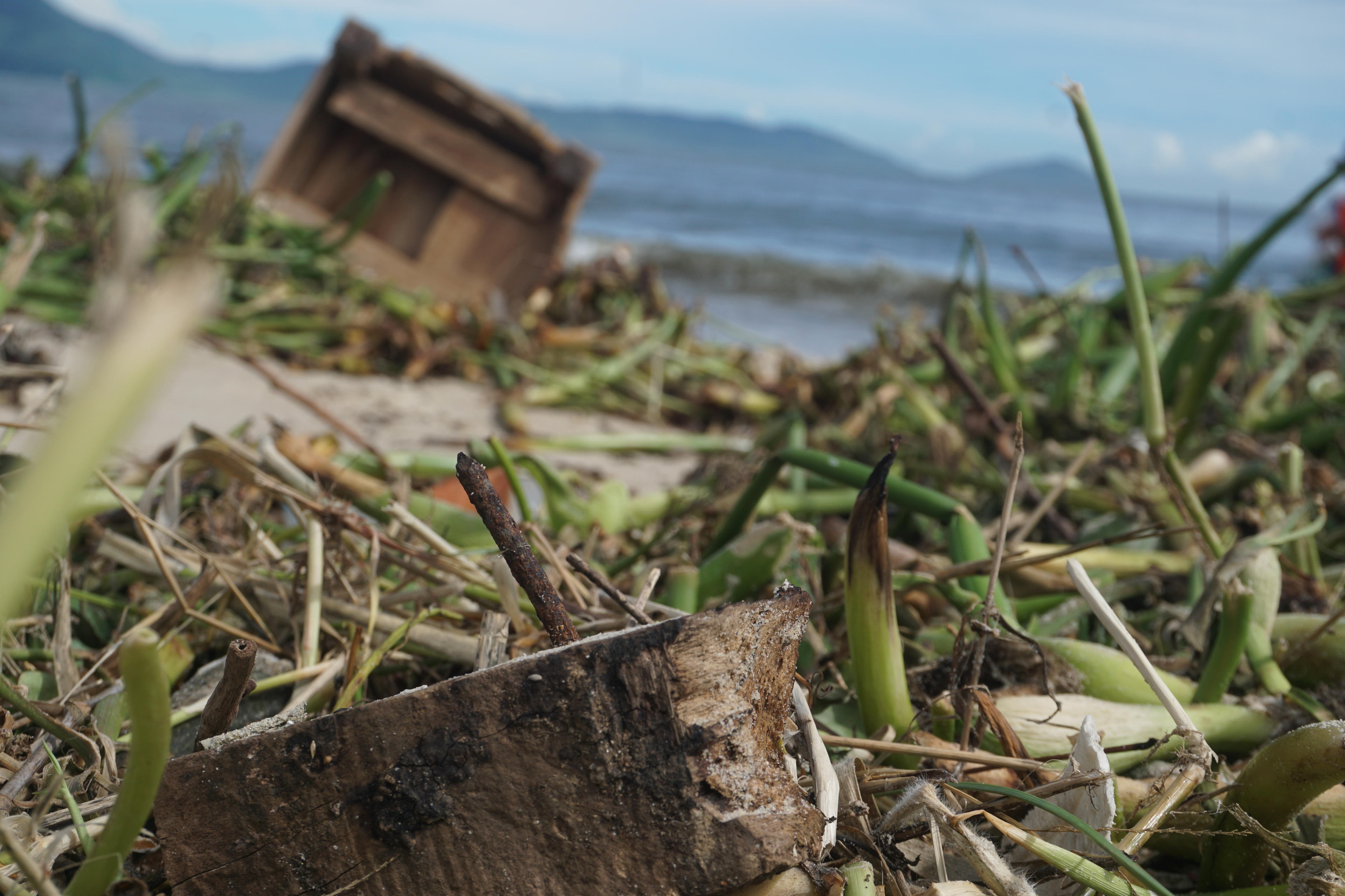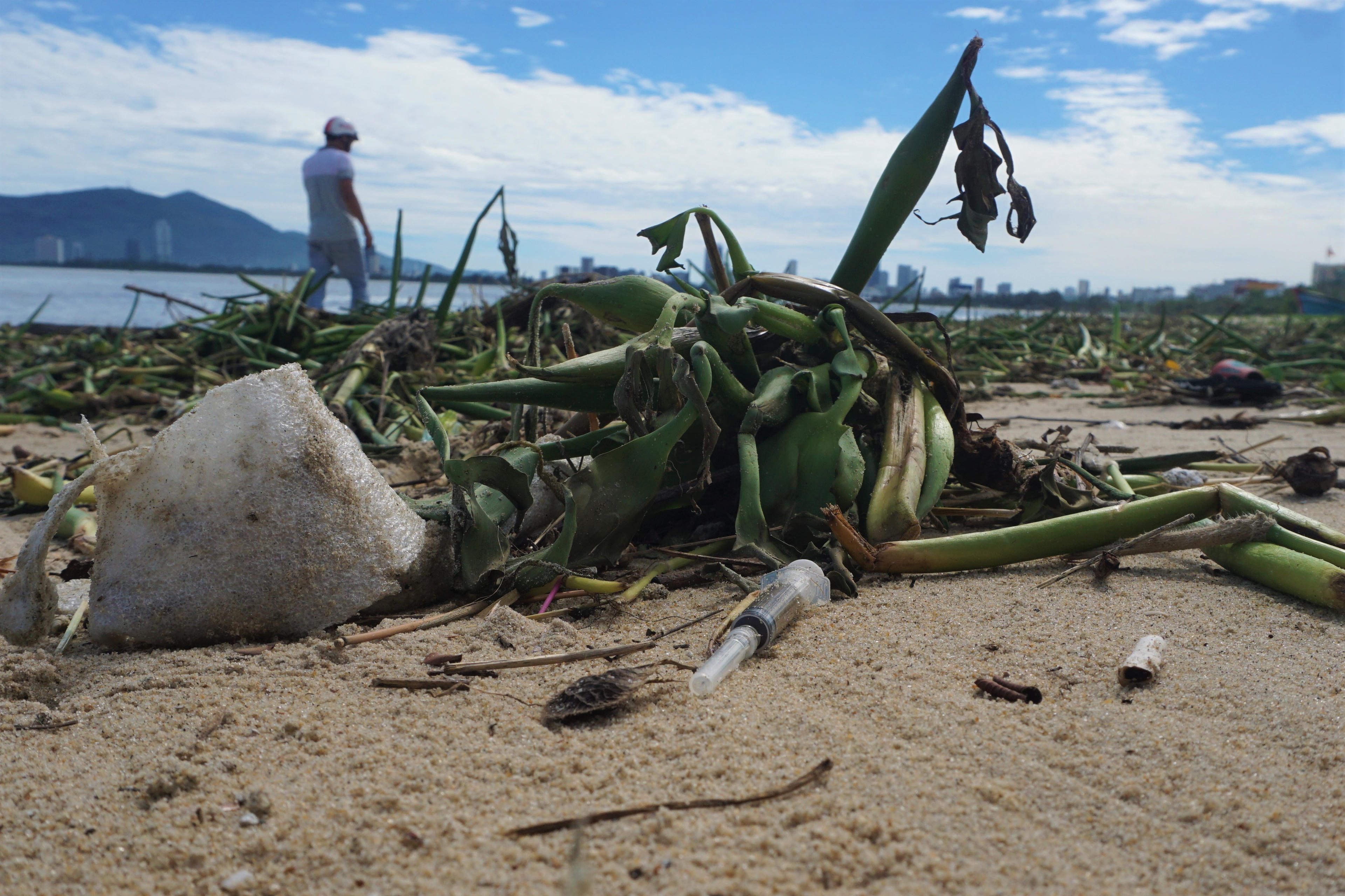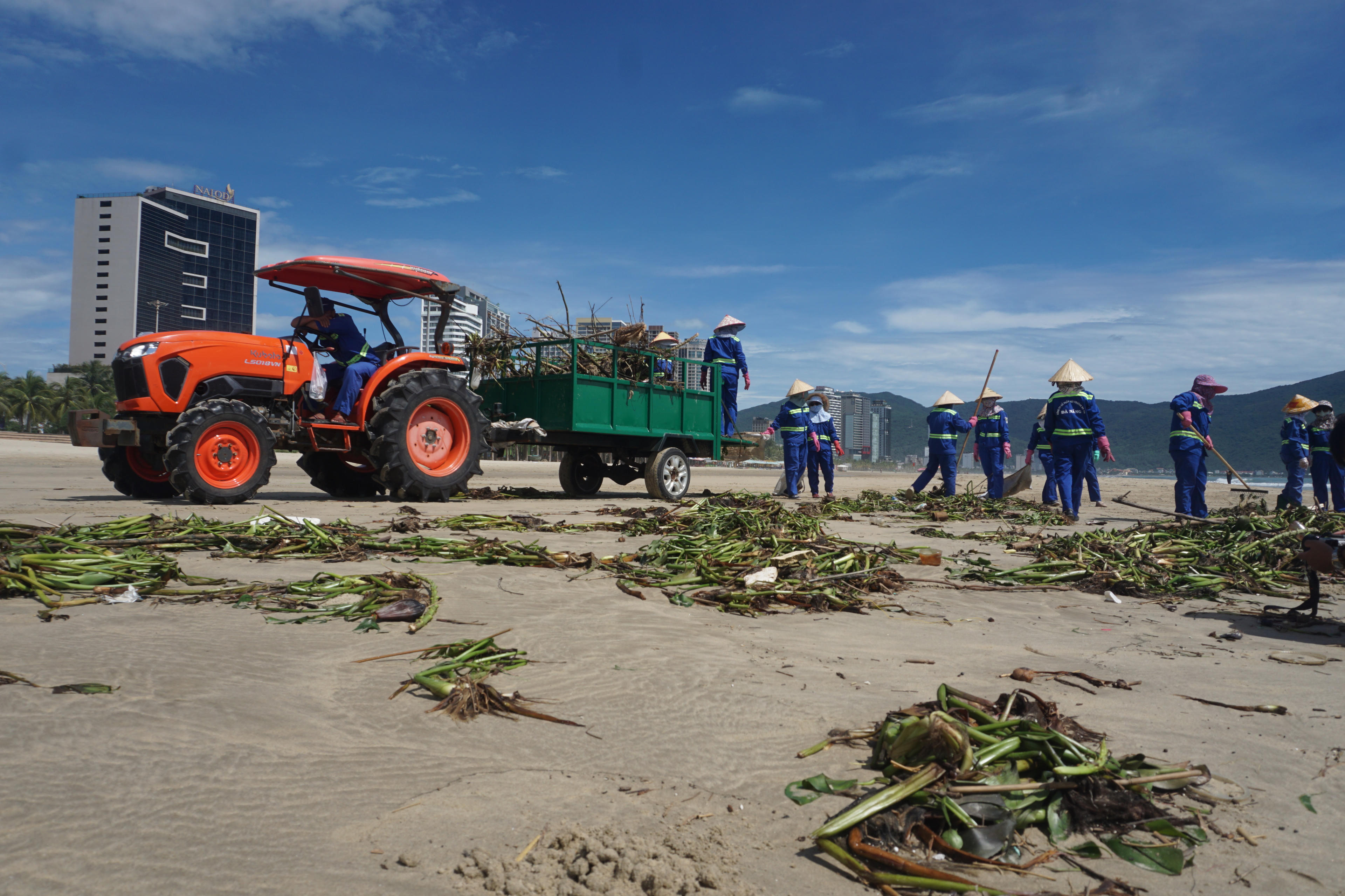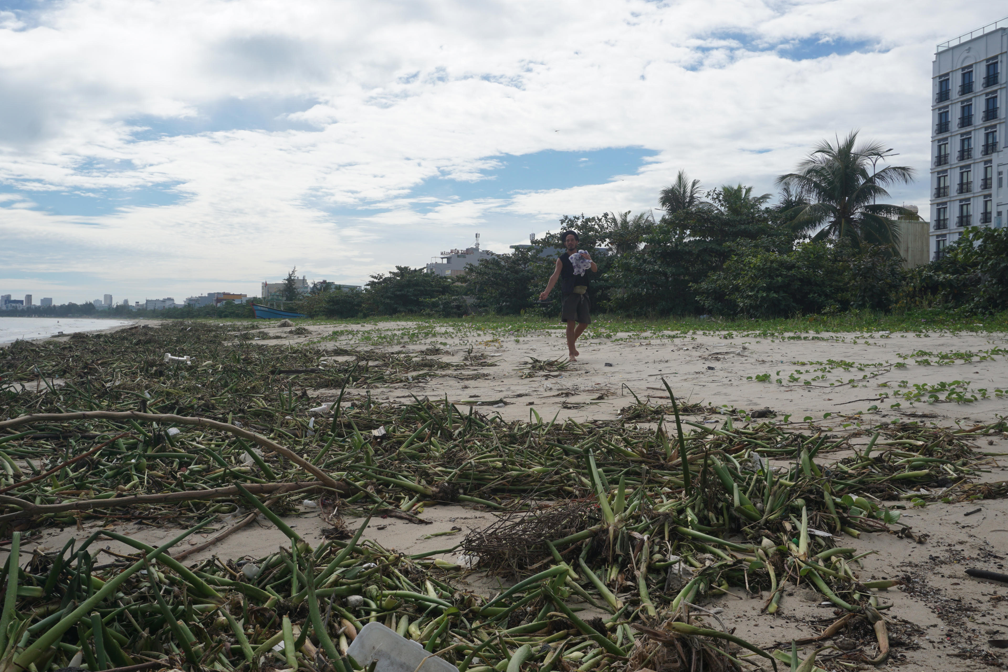 | Bãi biển dọc tuyến đường Võ Nguyên Giáp (quận Sơn Trà) rác thải cũng tấp vào bờ ở một số vị trí. Các loại rác tấp vào bờ biển chủ yếu là lục bình, cây củi khô. |