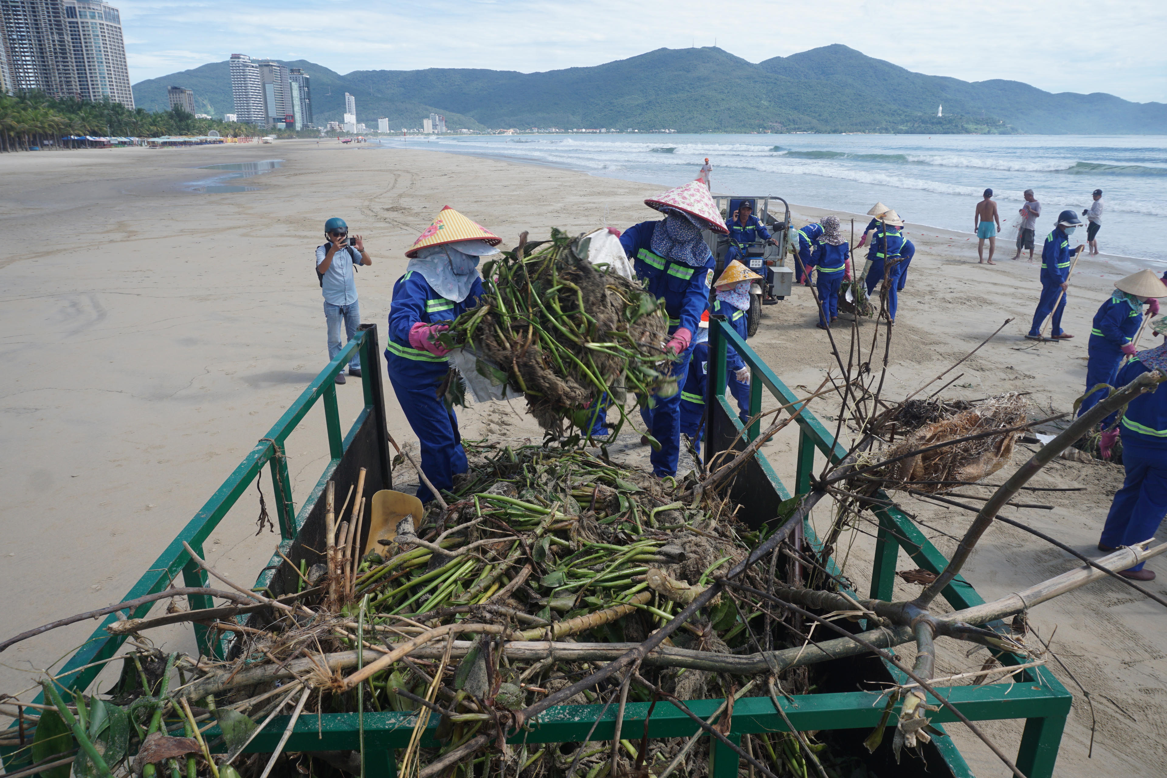 | Hiện tượng rác thải tràn vào bờ thường xảy ra ở các bãi biển Đà Nẵng sau bão. Rác thải từ khắp nơi theo dòng nước chảy ra biển. Khi thủy triều rút, rác thải bị mắc lại ở những bãi cát. |
