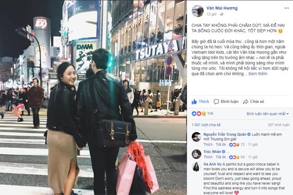Cuối cùng thay vì thù hận những gì người yêu cũ đã gây ra thì Văn Mai Hương chọn cách buông bỏ. "Ngày mai, rồi ai trong chúng ta cũng sẽ có một tình yêu mới, thì hãy tin là tôi sẽ luôn dành cho tình yêu ấy của anh một nụ cười. Tôi không giận anh, không hận anh, chỉ là năm tháng thanh xuân còn rất xanh, và tôi đang đi tìm mùa quả chín. Chia tay không phải là chấm dứt, mà để chúng ta bước vào một cuộc đời khác, đẹp đẽ hơn", Văn Mai Hương viết.