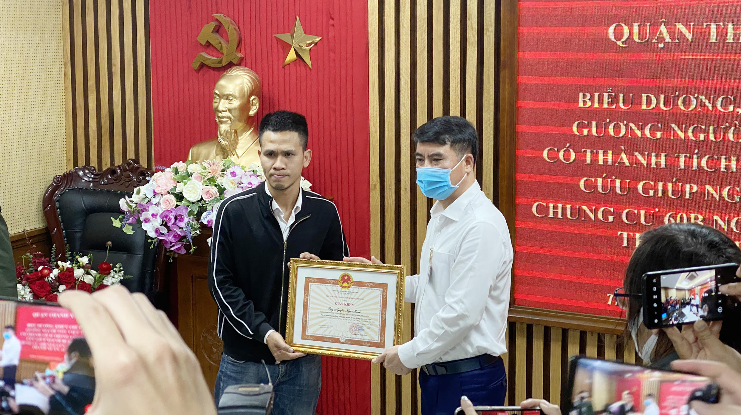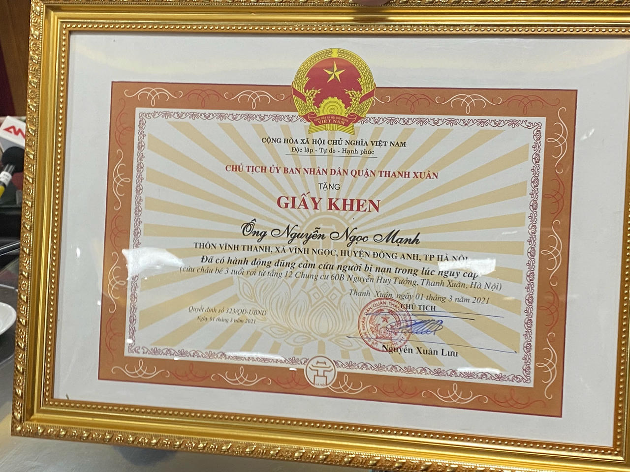 UBND quận Thanh Xuân đã quyết định tặng giấy khen cho anh Mạnh vì có hành động dũng cảm cứu bé gái rơi từ tầng 12A chung cư ở phố Nguyễn Huy Tưởng, phường Thanh Xuân Trung, quận Thanh Xuân, TP Hà Nội.