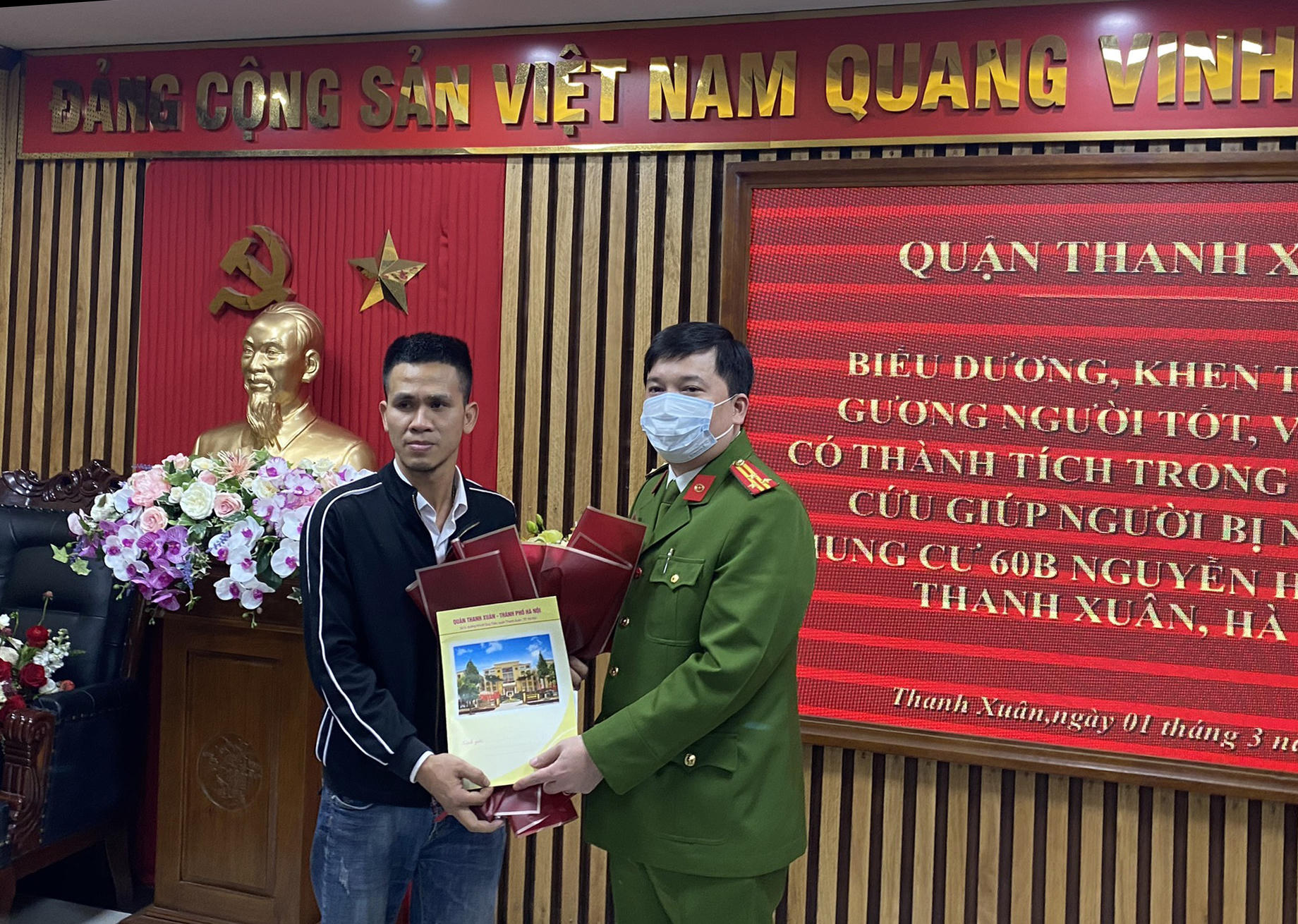 (PLVN) - Chiều 1/3, Công an Quận Thanh Xuân biểu dương, khen thưởng anh Nguyễn Ngọc Mạnh (31 tuổi, trú tại thôn Vĩnh Thanh, xã Vĩnh Ngọc, H.Đông Anh, Hà Nội) đỡ kịp thời bé gái 3 tuổi rơi từ tầng 12A chung cư 60B Nguyễn Huy Tưởng (P.Thanh Xuân Trung, Q.Thanh Xuân, Hà Nội).