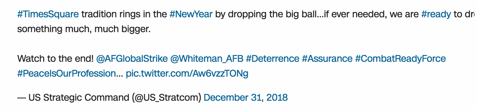 Người phát ngôn của Bộ chỉ huy lực lượng vũ trang Mỹ, Đại úy hải quân Brook Dewalt, nói với CNN rằng bài Tweet này nhấn mạnh “ưu tiên hàng đầu của quân đội Mỹ” và tất cả là để trấn an người dân Mỹ rằng quân đội Mỹ luôn sẵn sàng, ngay cả vào đêm giao thừa.