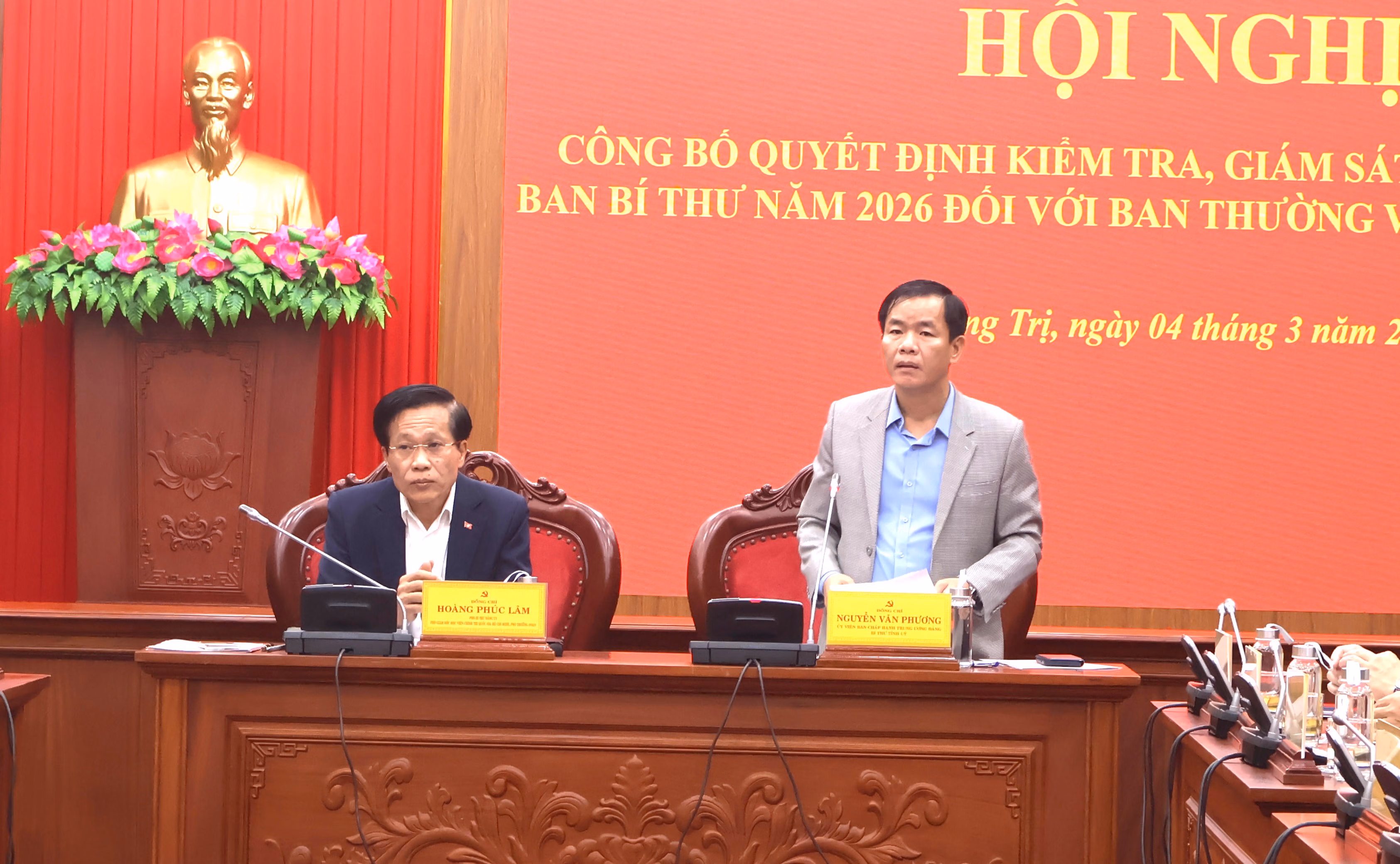Các ông Nguyễn Văn Phương, Ủy viên Trung ương Đảng, Bí thư Tỉnh ủy Quảng Trị và Hoàng Phúc Lâm, Phó Bí thư Đảng ủy, Phó Giám đốc Học viện Chính trị quốc gia Hồ Chí Minh, Phó trưởng Đoàn kiểm tra, giám sát số 27 chủ trì hội nghị.