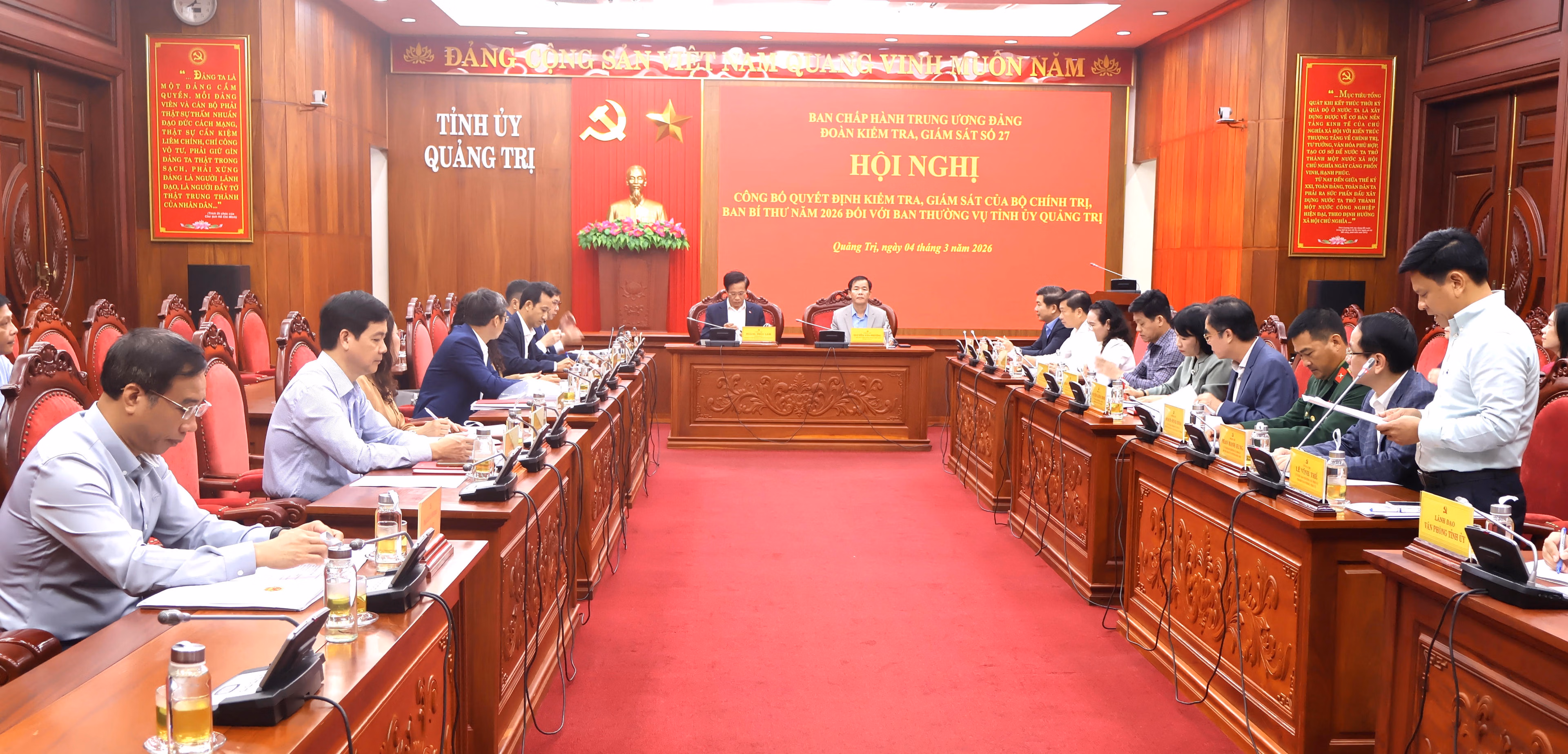 Tại hội nghị, Đoàn kiểm tra công bố Quyết định số 27 ngày 23/2/2026 của Bộ Chính trị về thành lập Đoàn kiểm tra, giám sát của Bộ Chính trị, Ban Bí thư; đồng thời quán triệt kế hoạch, nội dung và thời gian tiến hành kiểm tra, giám sát đối với Ban Thường vụ Tỉnh ủy Quảng Trị.