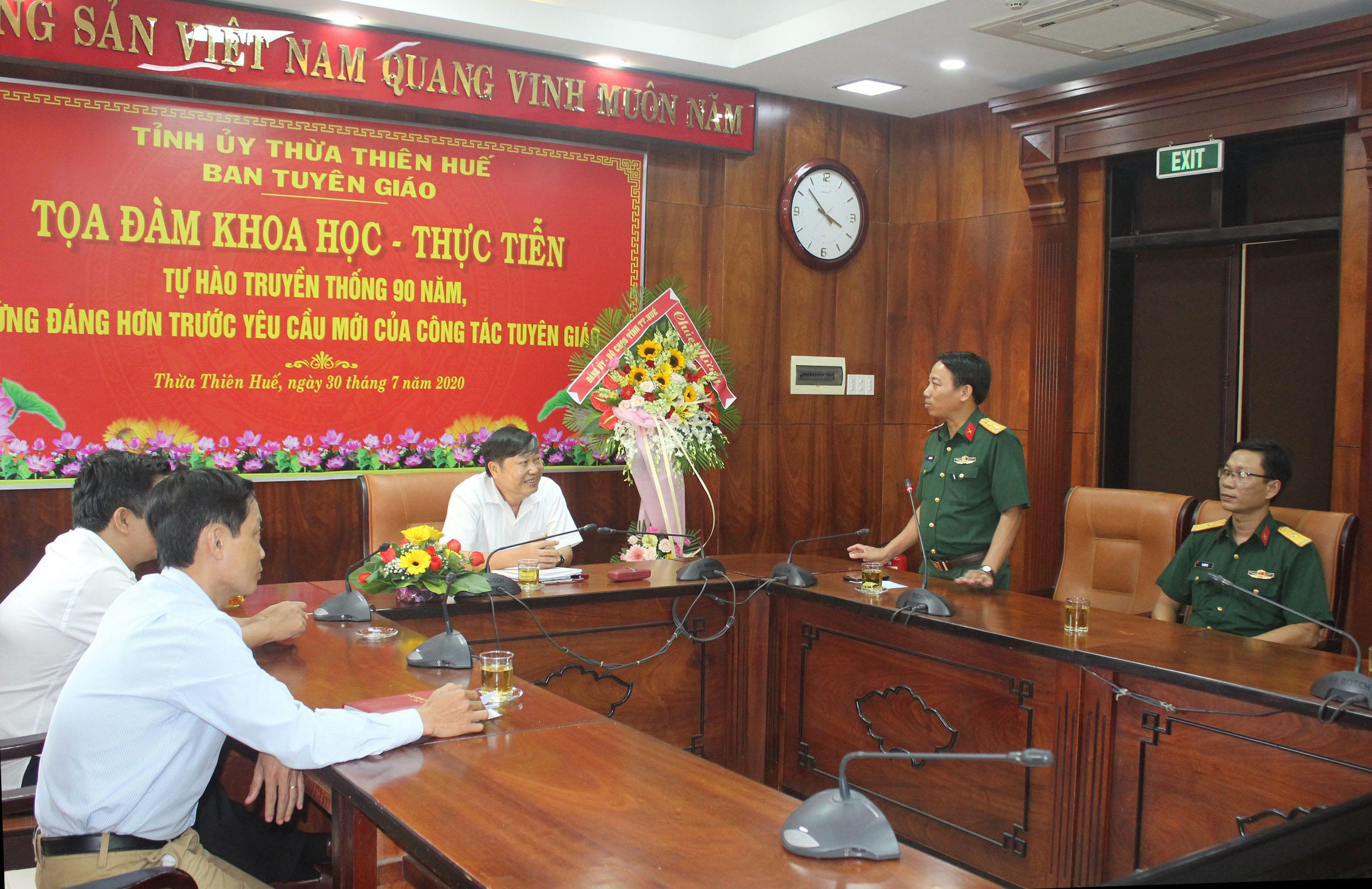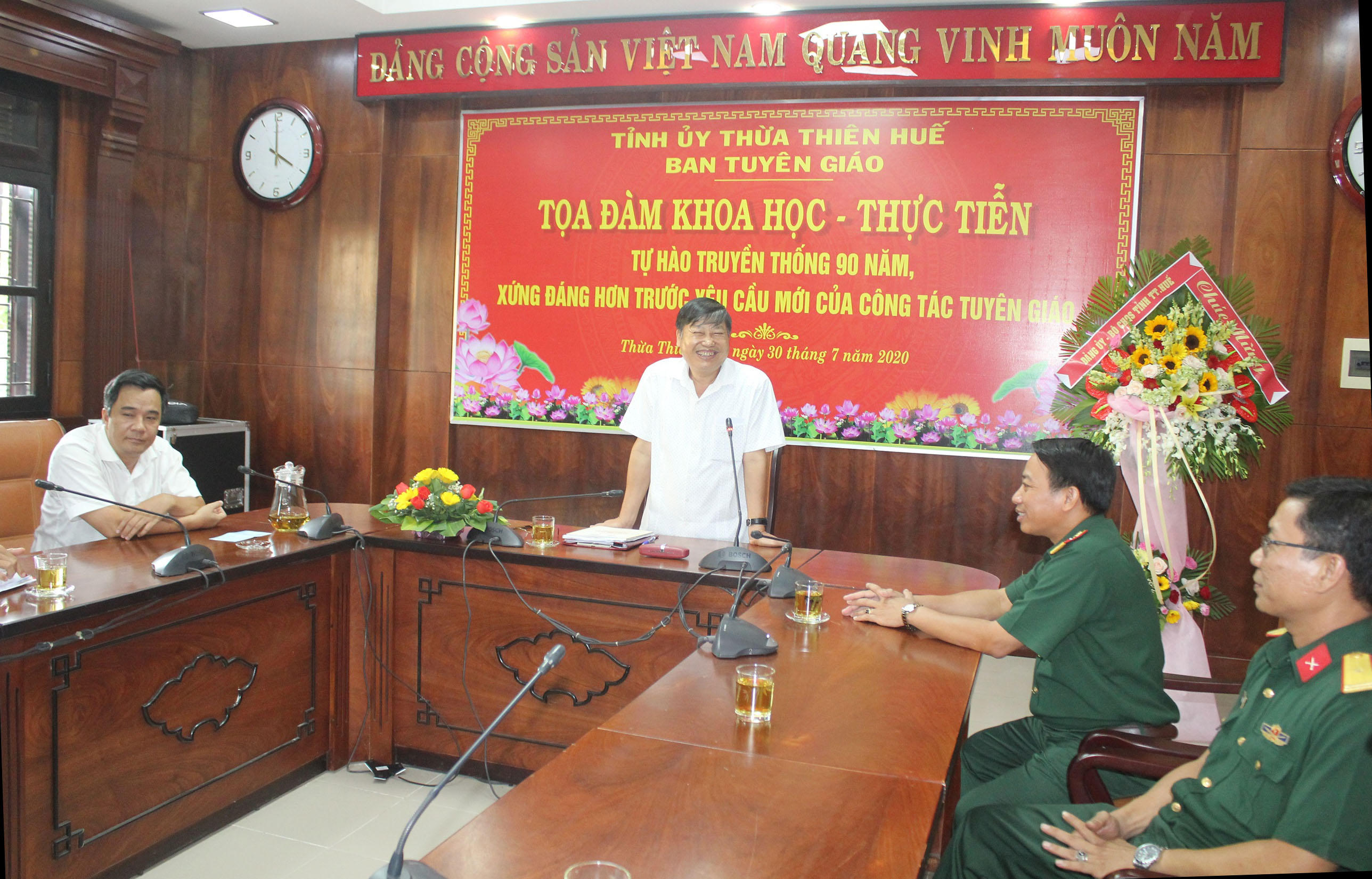 (PLVN) - Nhân dịp kỷ niệm 90 năm Ngày truyền thống ngành Tuyên giáo của Đảng (1/8/1930 - 1/8/2020), Đại tá Hà Văn Ái, Phó Chính ủy Bộ Chỉ huy Quân sự tỉnh Thừa Thiên Huế đã đến thăm, tặng hoa, chúc mừng tập thể lãnh đạo, cán bộ, công chức Ban Tuyên giáo Tỉnh ủy.