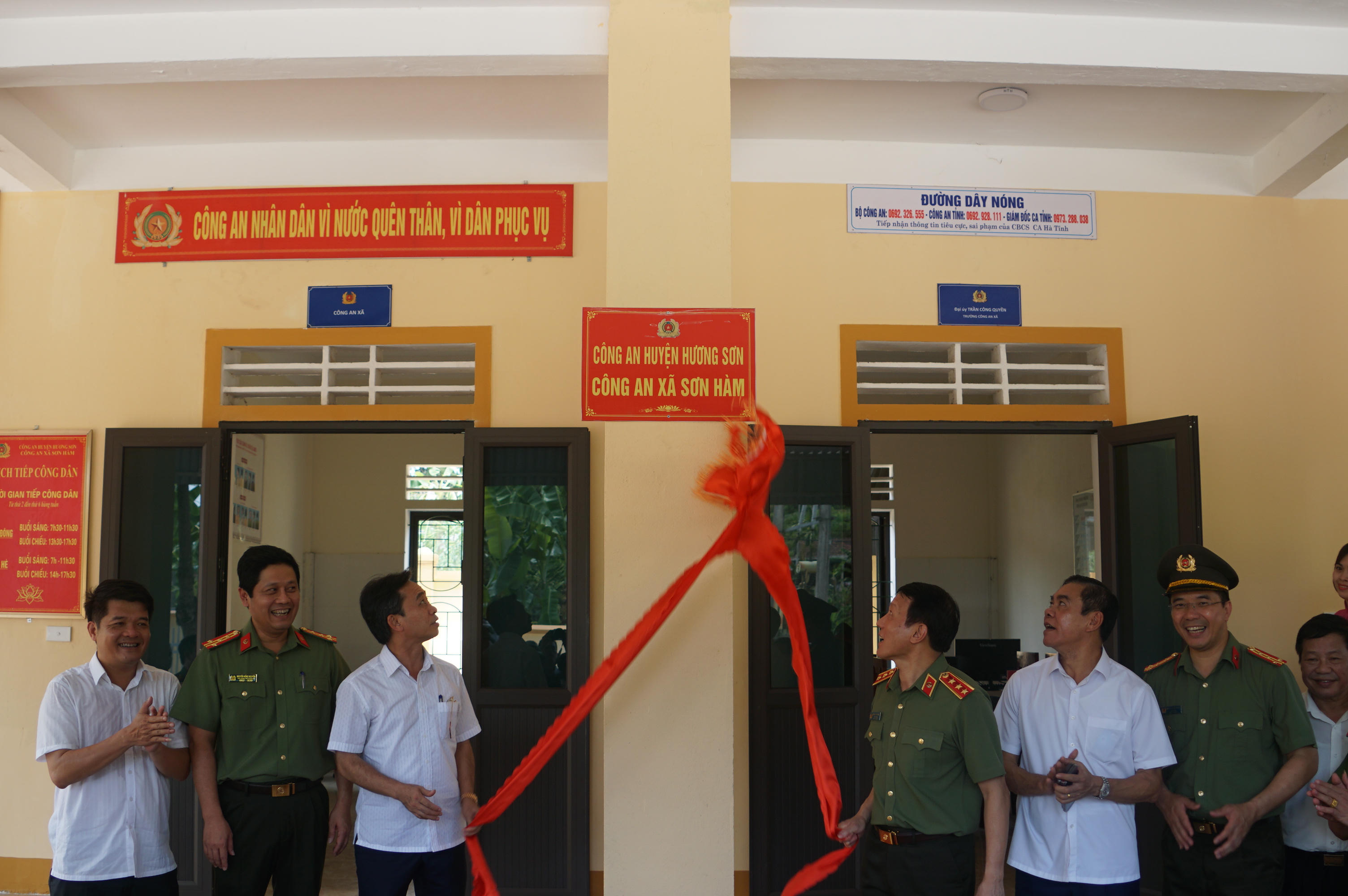 Thượng tướng Lương Tam Quang - Thứ trưởng Bộ Công an cùng lãnh đạo tỉnh Hà Tĩnh hạ băng khánh thành trụ sở công an xã Sơn Hàm. |