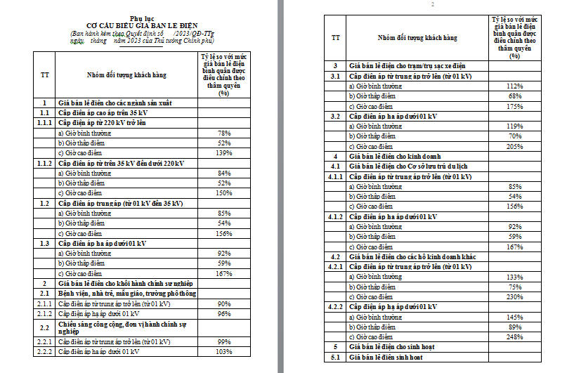 Giá bán lẻ điện theo các cấp điện áp gồm: cao áp trên 35 kV (bao gồm cấp điện áp từ trên 35 kV đến dưới 220 kV và cấp điện áp từ 220 kV trở lên), trung áp từ 01 kV đến 35 kV, hạ áp dưới 01 kV áp dụng cho các nhóm khách hàng sản xuất, kinh doanh, hành chính sự nghiệp, trạm/trụ sạc xe điện và cơ sở lưu trú du lịch.