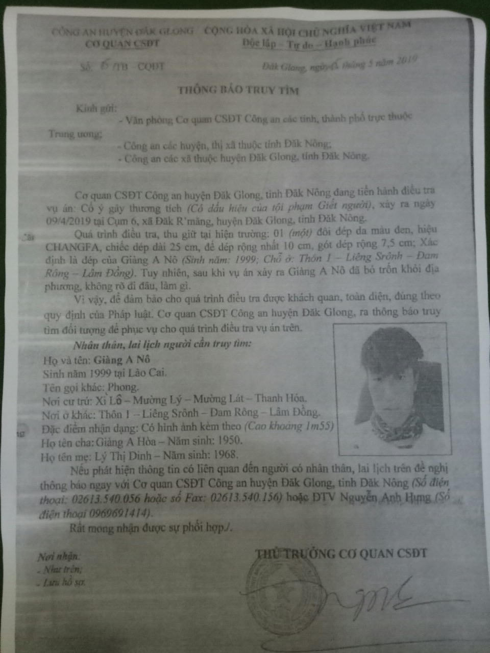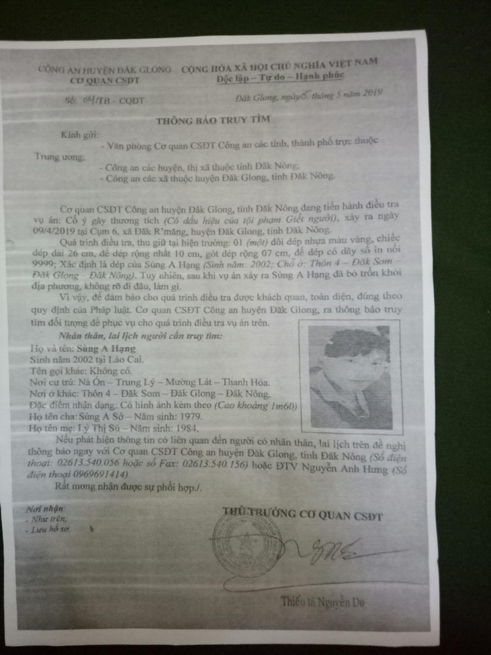 Trước đó, Đồn Biên phòng Si Ma Cai đã nhận được thông báo truy tìm của Cơ quan Cảnh sát điều tra công an huyện Đắk Glong về vụ án cố ý gây thương tích (hành vi có dấu hiệu phạm tội giết người) xảy ra ngày 9/4/2019 tại cụm 6, tổ 4, xã Đắk Som, huyện Đắk Glong, tỉnh Đắk Nông. Quá trình truy xét vụ án, cơ quan điều tra xác định cả 2 đối tượng Sùng A Hạng và Giàng A Nô trong diện nghi vấn đã bỏ đi khỏi địa phương.