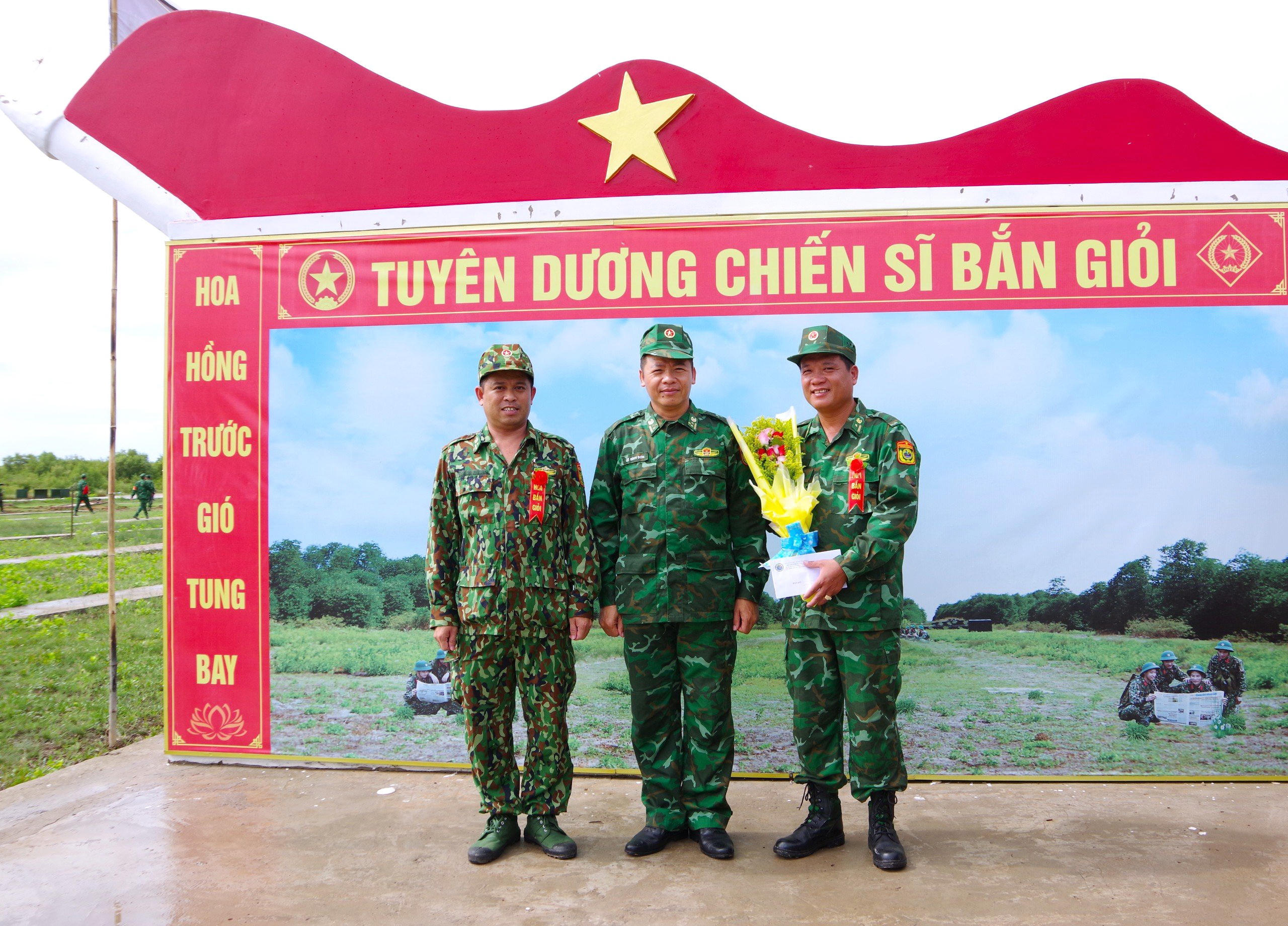 Thượng tá Lê Đình Sơn - Phó Chỉ huy trưởng kiêm Tham mưu trưởng BĐBP tỉnh Cà Mau (giữa) tặng hoa chúc mừng cho cá nhân đạt thành tích bắn giỏi tại thao trường. |