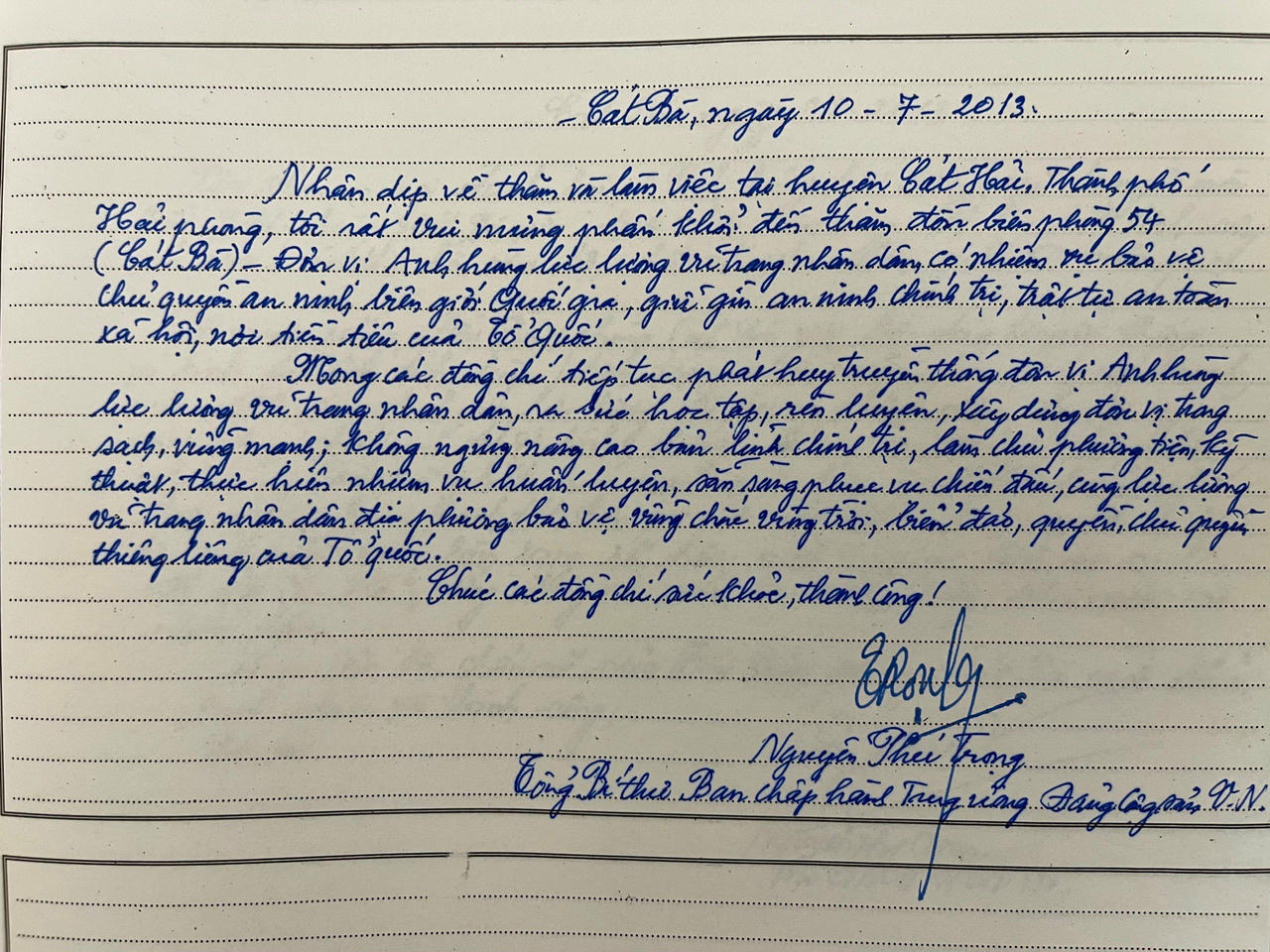 Tổng Bí thư Nguyễn Phú Trọng ghi sổ vàng truyền thống khi đến thăm Đồn Biên phòng Cát Bà, ngày 10/7/2013. |