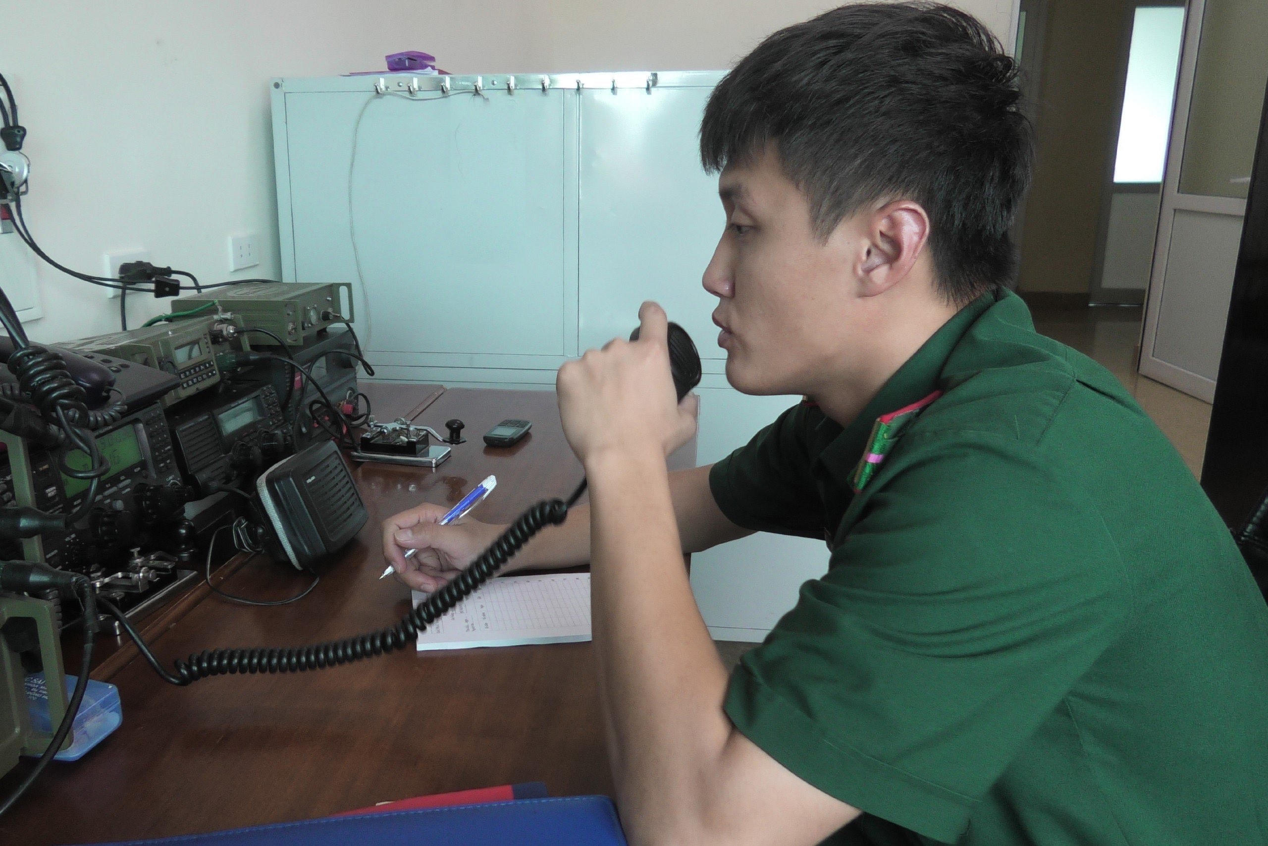 Lực lượng Bộ đội Biên phòng Quảng Bình thông tin cho các đơn vị thông báo và kêu gọi ngư dân di chuyển về bờ hoặc tìm nơi trú ẩn an toàn. Ảnh: Hoài Nam |