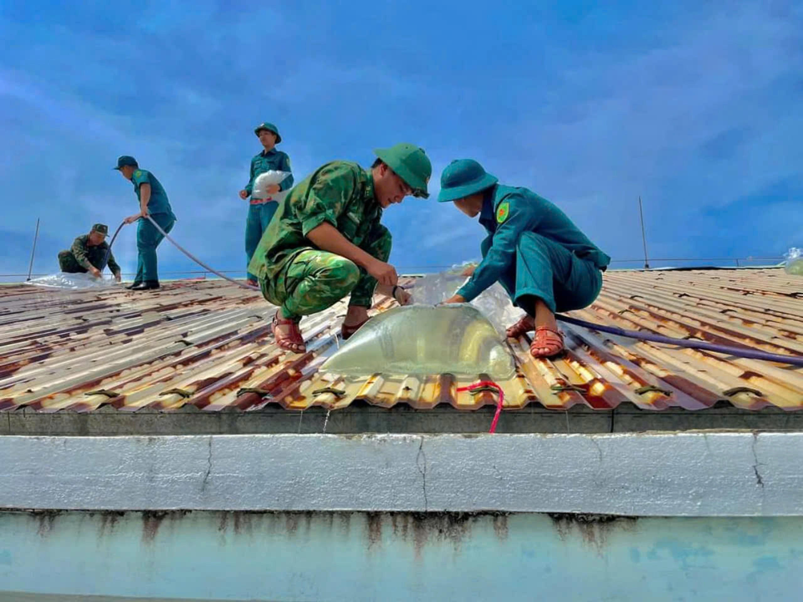 Bao nước được vận chuyển lên để giữ chắc mái nhà. (Ảnh Công Huy) |