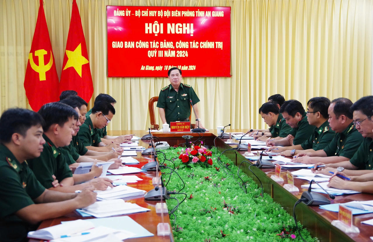 (PLVN) - Ngày 10/10, Đảng ủy Bộ Chỉ huy Bộ đội Biên phòng (BĐBP) tỉnh An Giang tổ chức giao ban công tác Đảng, công tác chính trị quý III năm 2024. Thượng tá Nguyễn Văn Hiệp - Bí thư Đảng ủy, Chính ủy BĐBP tỉnh chủ trì hội nghị.