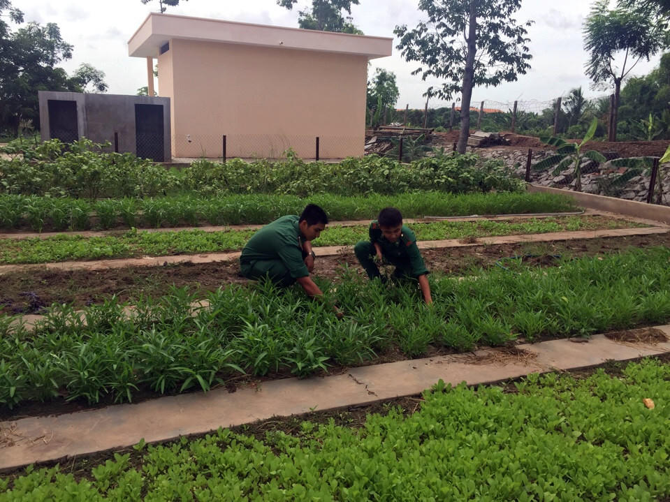 Tận dụng điều kiện của đơn vị, từ nguồn kinh phí đầu tư trên, đơn vị đã huy động cán bộ, chiến sĩ tham gia với hơn 2.300 ngày công lao động để xây dựng khu tăng gia sản xuất tập trung rộng 1.500 m2 (gồm 2 vườn rau; 1 giàn rau thủy canh; 4 giàn bầu bí; 1 ao thả cá). Hệ thống vườn, ao, chuồng được quy hoạch khép kín có tường rào và hệ thống tưới tiêu hoàn chỉnh, đường đi nội bộ được đổ bê tông để trồng các loại rau, củ, quả, gia vị; khu chăn nuôi heo, gia cầm tận dụng phế phẩm của đơn vị, 1 ao nuôi cá tra và cá chép giòn. Đơn vị còn trồng hơn 600 gốc chuối, 200 gốc xoài, 300 gốc đu đủ… Mỗi khu vực trồng trọt, chăn nuôi được giao cho các đội phụ trách riêng; ngoài giờ làm việc tất cả cán bộ, chiến sĩ đều tham gia tăng gia sản xuất.