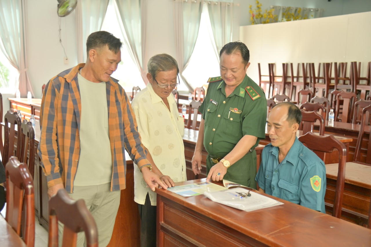 Trung tá Nguyễn Quang Chi, phó Chủ nhiệm chính trị, Bộ đội Biên phòng tỉnh Kiên Giang hướng dẫn bà con ngư dân tìm hiểu các nội dung về IUU trong tờ rơi do Bộ đội Biên phòng cấp phát. |