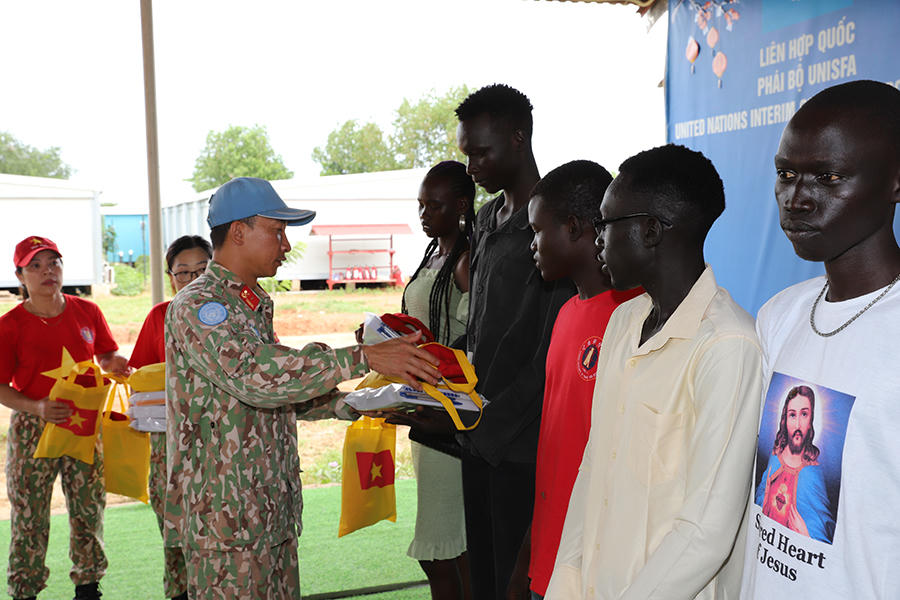 Nhân dịp này, Đội công binh số 2 đã trao giá sách, đồ chơi, sách vở tặng Trường học Nhà thờ Abyei; trao quà tặng 10 học sinh tiêu biểu đỗ đại học tại Abyei trong năm vừa qua.