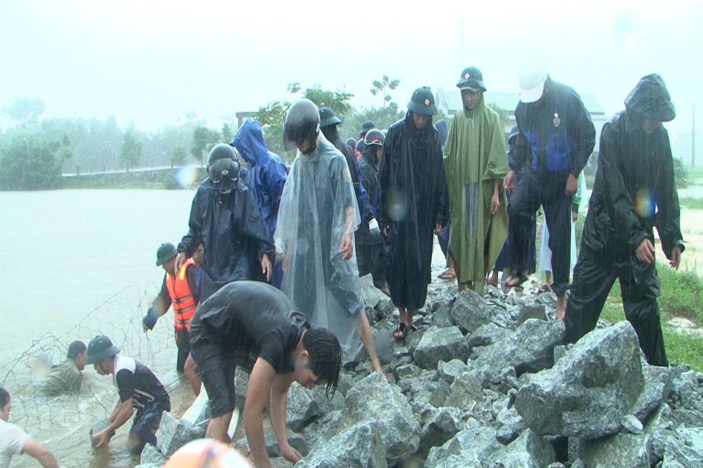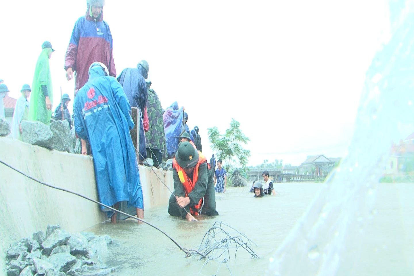 Mặc dù trời mưa rất to, nước sông chảy xiết, việc xếp kè rọ đá vào vị trí bị sạt lở rất khó khăn, nhưng với tinh thần khẩn trương, trách nhiệm cao nhất, các cán bộ, chiến sĩ, lực lượng dân quân địa phương cùng với các lực lượng tham gia đã không quản khó khăn, gian khổ, kịp thời triển khai mọi biện pháp để gia cố đoạn đê.