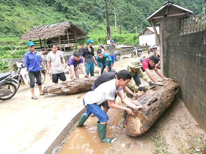 Bên cạnh đó, mưa lớn cũng làm sạt lở 2.350 m3 đường giao thông ở huyện Na Hang, gây ách tắc giao thông. Hiện LLVT các địa phương giúp người dân dựng lại nhà bị đổ, sập, dọn dẹp bùn rác, vệ sinh môi trường.