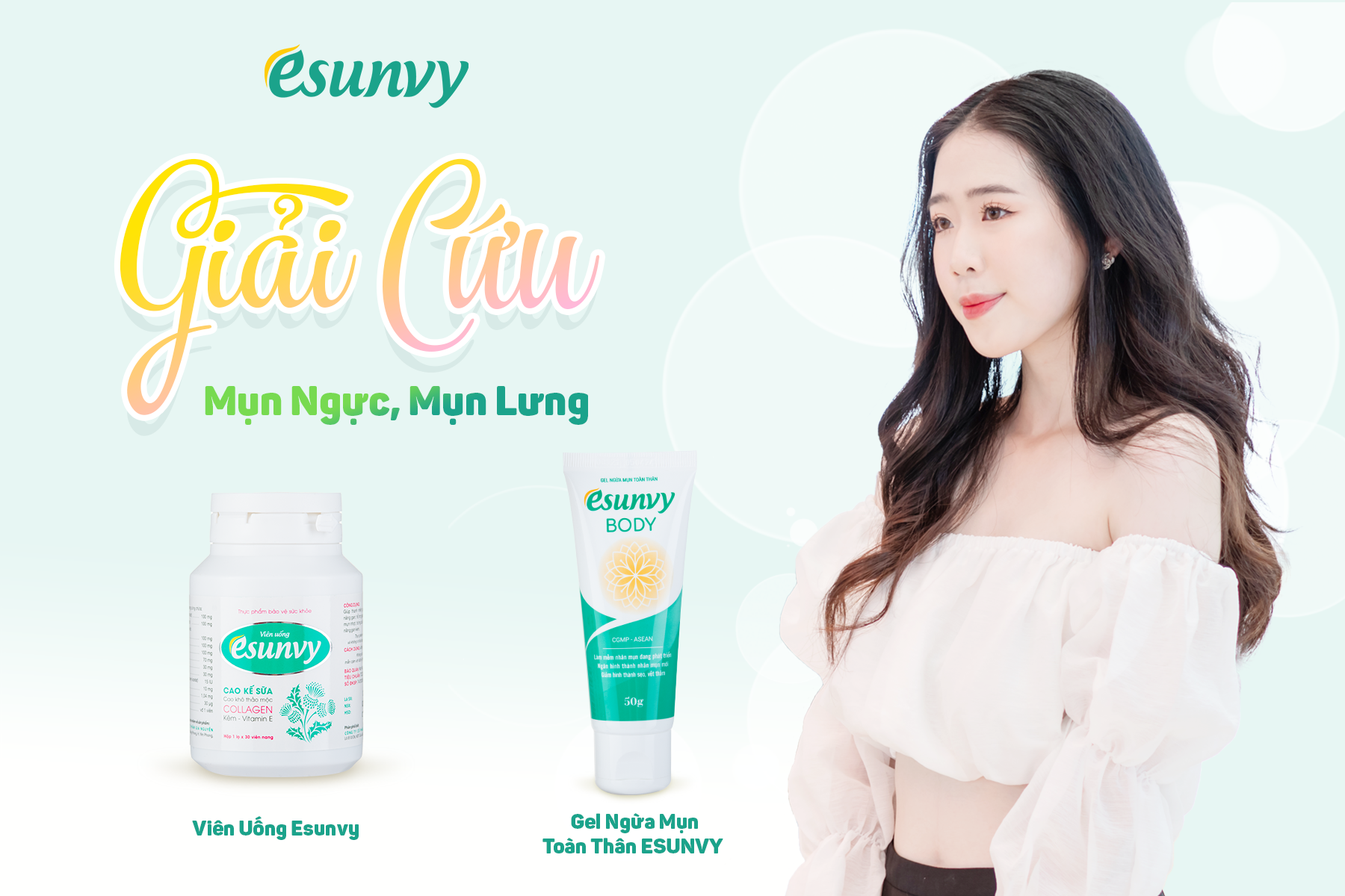 Bộ đôi giải quyết mụn lưng-mụn ngực hiệu quả: Gel ngừa mụn toàn thân & Viên uống Esunvy