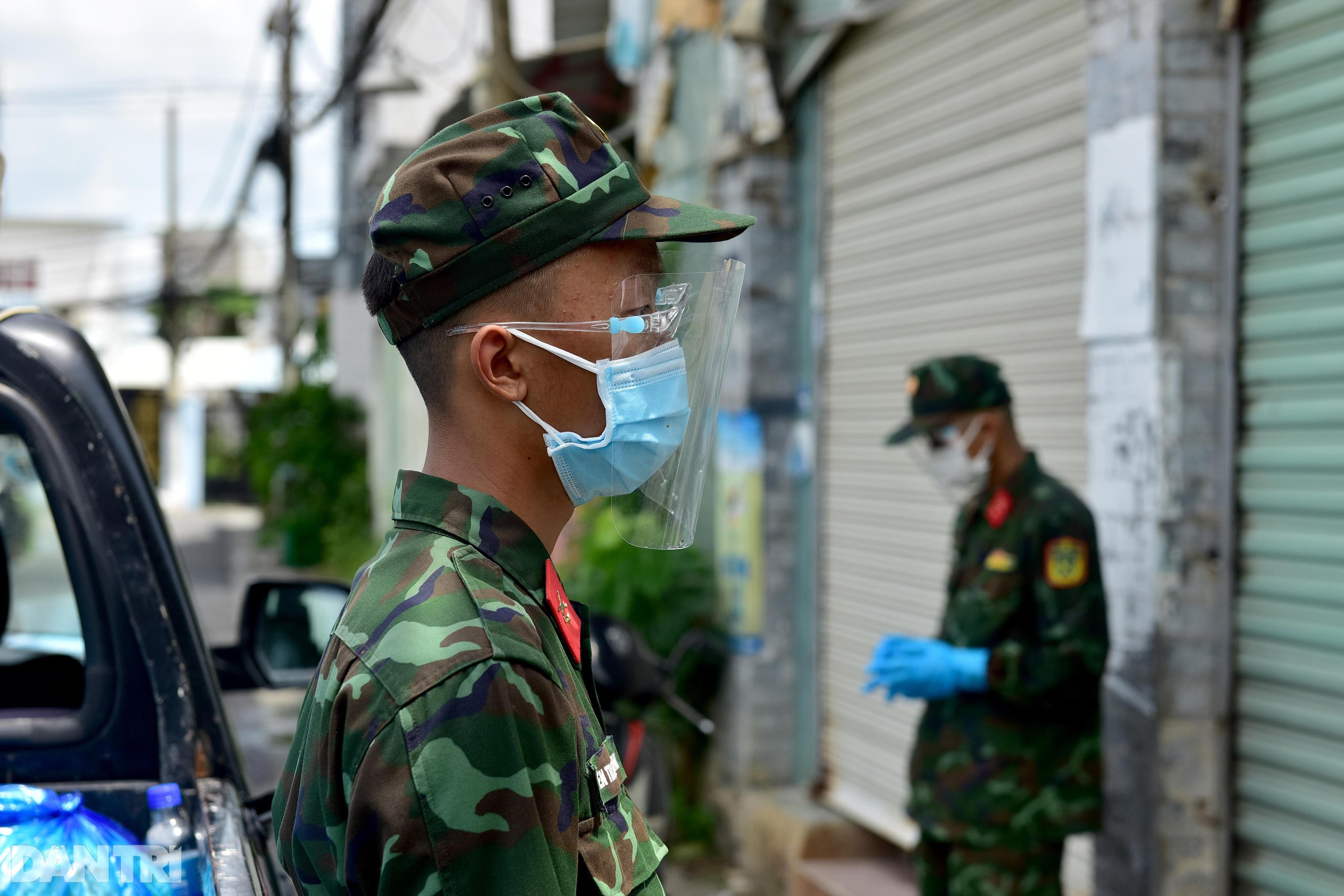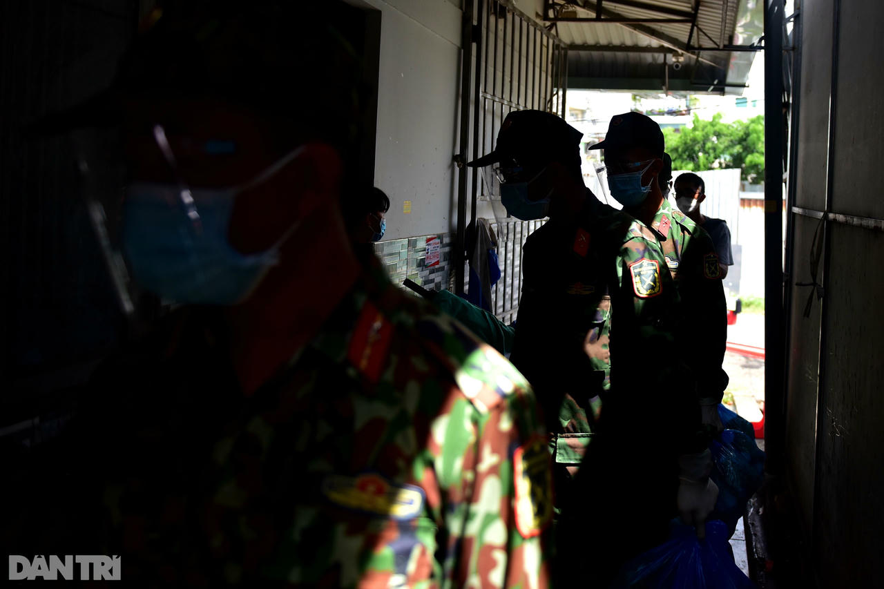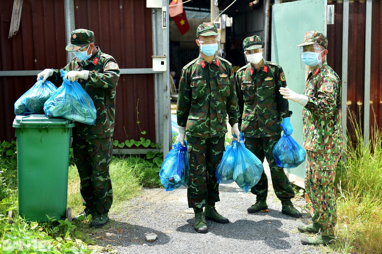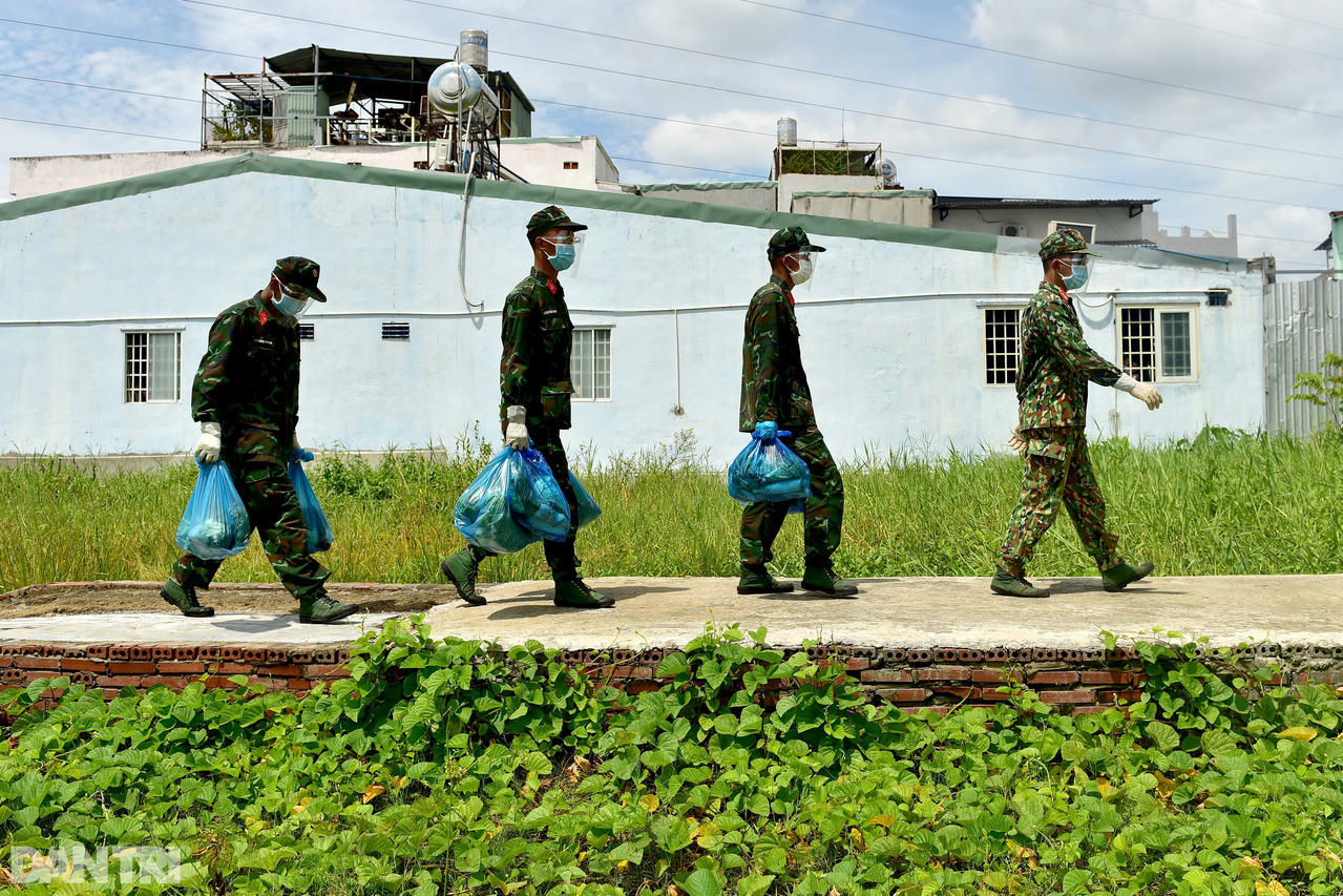 Trước khi làm nhiệm vụ, Trung sĩ Nguyễn Nhật Hoàng dặn dò các chiến sĩ: "Nhiệm vụ của chúng ta là gửi các phần thực phẩm cho người dân, nếu người dân có thắc mắc gì thì nhờ phường hỗ trợ giải đáp. Các em trao tận tay người dân xong thì rời sang hẻm khác tiếp tục công việc".