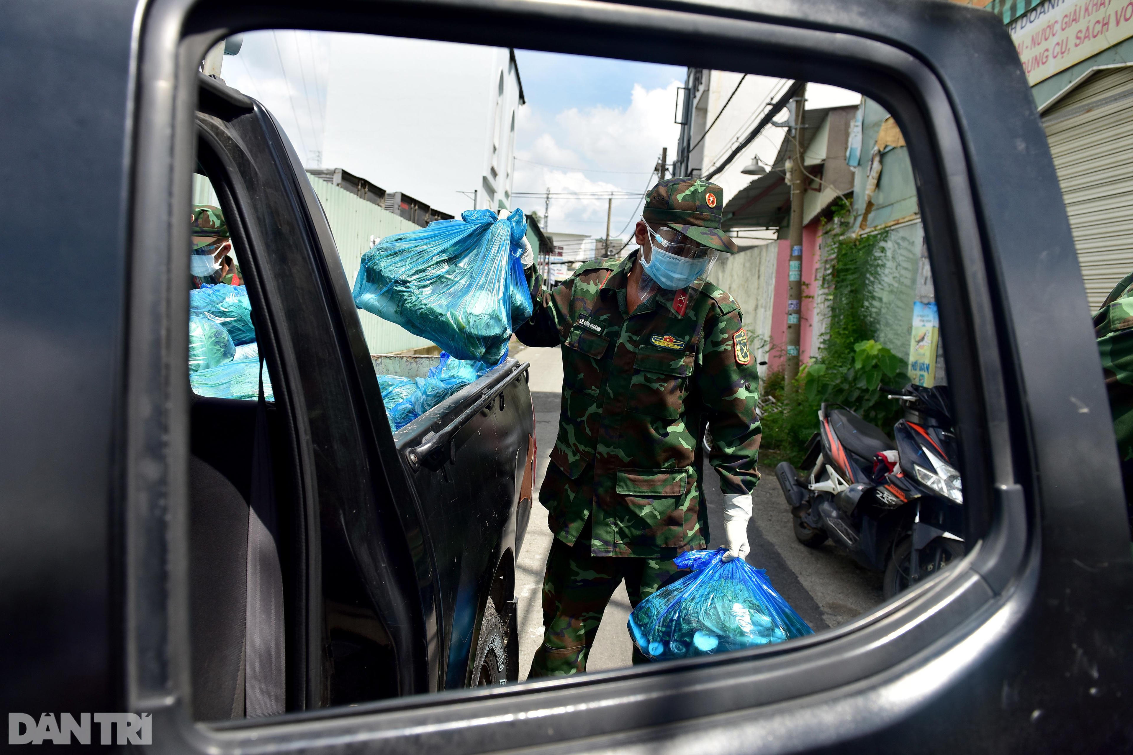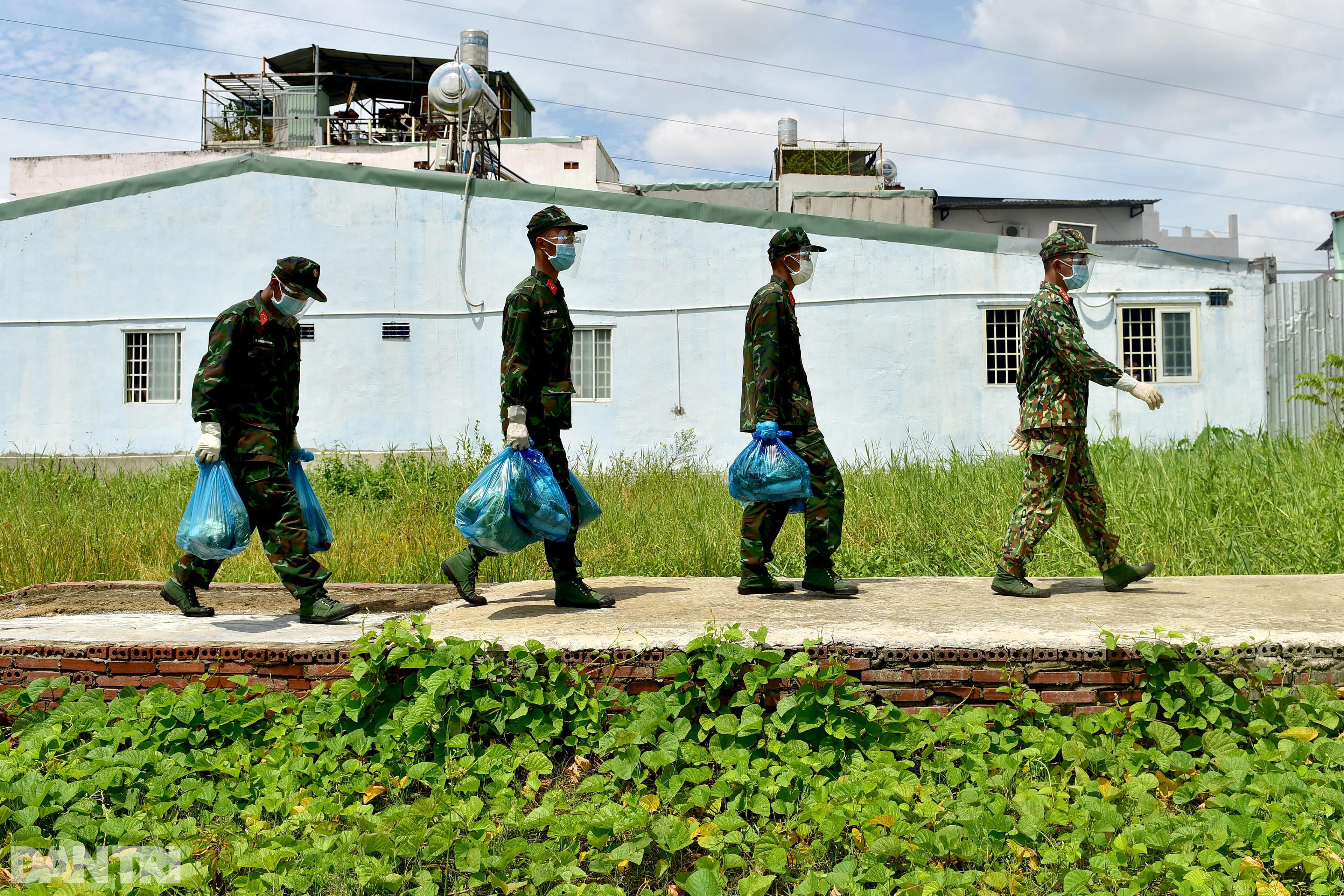 Mỗi nhóm đi trao thực phẩm gồm có một tiểu đội trưởng và 3 chiến sĩ. Tới đường số 11 phường Trường Thọ, nhóm chiến sĩ xách từng túi rau củ đi vào nhà dân trao tận tay cho bà con. Mỗi túi gồm 5 kg rau, củ, quả tươi sạch các loại, đủ cho một gia đình sử dụng trong 2-3 ngày.