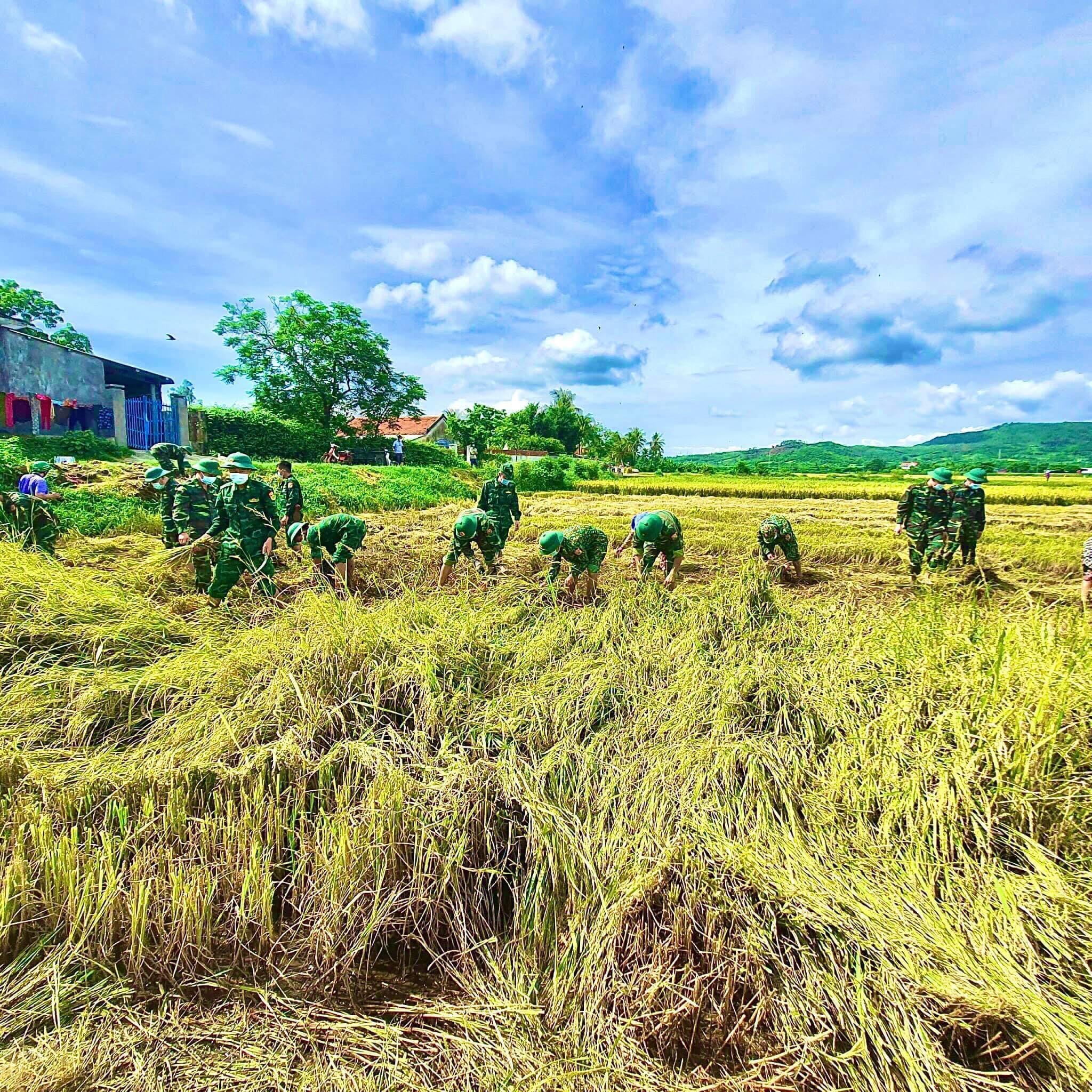 Các chiến sĩ giúp người dân thu hoạch lúa |