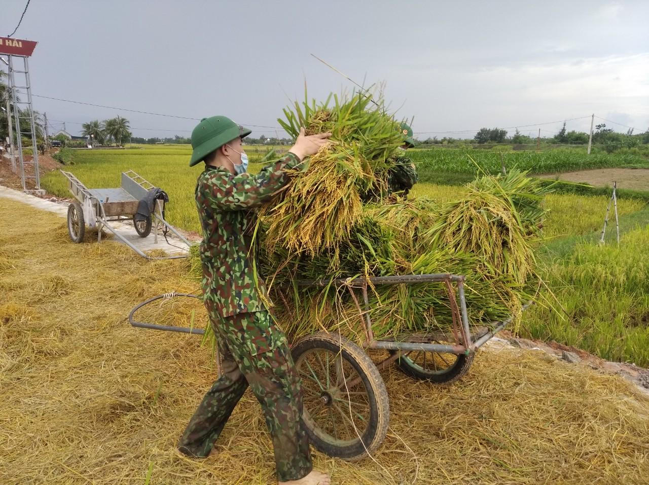 Trước đó, tại các xã ven biển huyện Diễn Châu (tỉnh Nghệ An), cán bộ chiến sỹ Đồn Biên phòng Diễn Thành (Bộ đội Biên phòng Nghệ An) cũng xuống đồng gặt lúa giúp dân.
