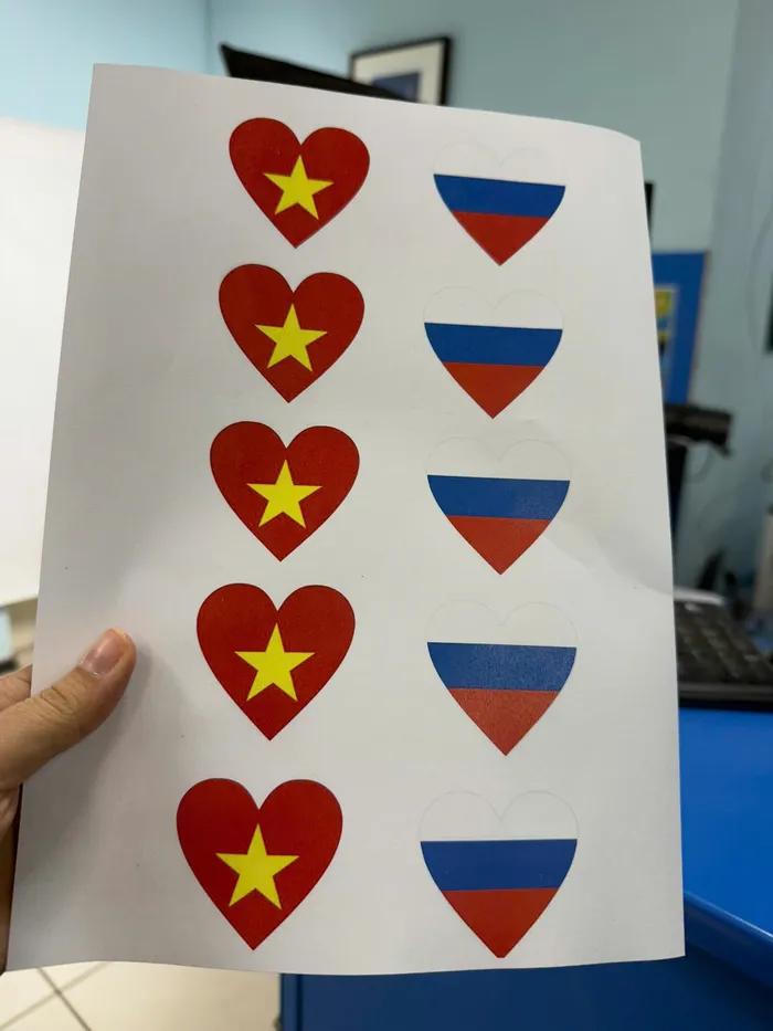 Hoàng Yến có em trai là chiến sĩ trực tiếp tham gia diễu binh, chị chuẩn bị sẵn sticker cờ Việt Nam và Nga để cổ vũ các khối. Ảnh: NVCC. |