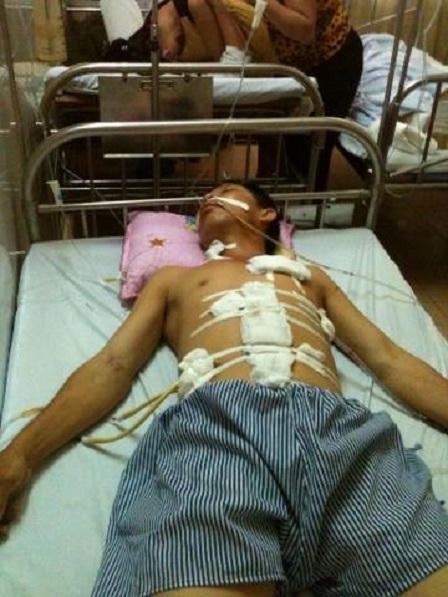 Hai bố con Việt đuổi theo, đập cửa. Bố của Mạnh là Nguyễn Viết Đề ra mở đã bị Việt bố con Việt đâm trọng thương. Ngay sau đó, người nhà đã đưa ông Đề đi bệnh viện 103 cấp cứu. Tại đây bác sĩ cho biết, bệnh nhân Đề bị đâm một nhát vào ngực, sườn, và dưới bụng. Một vết đâm ở đằng sau lưng khiến rạn phổi, phải hút dịch ở phổi.