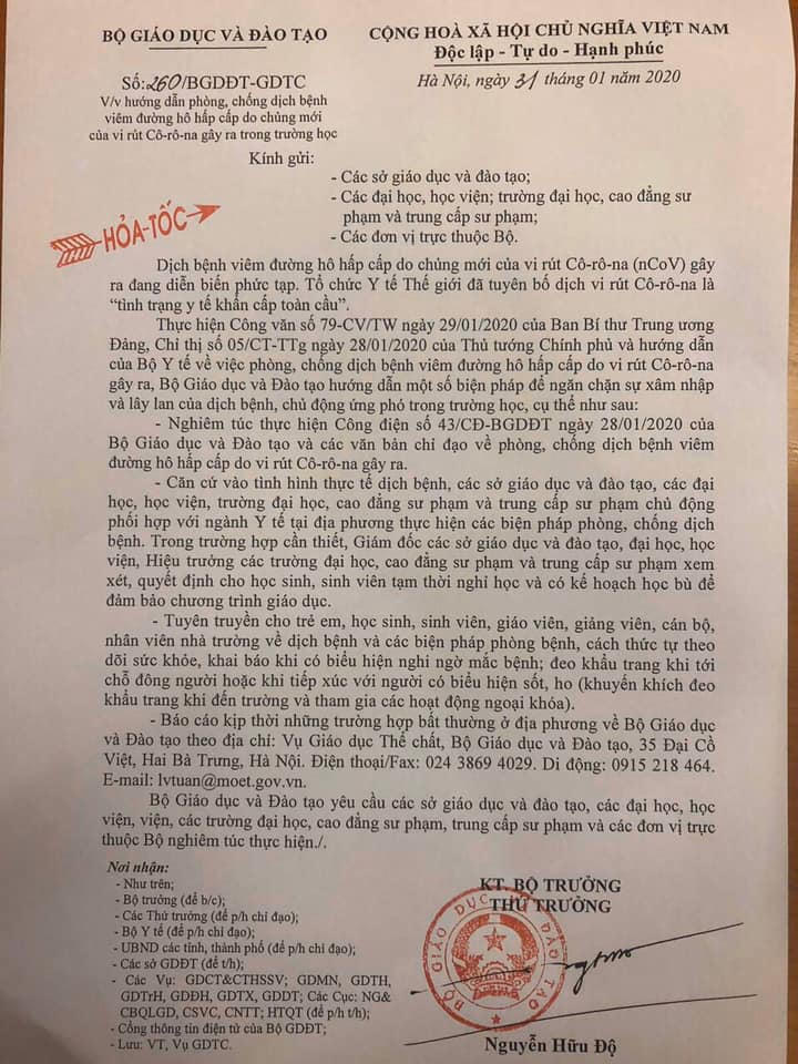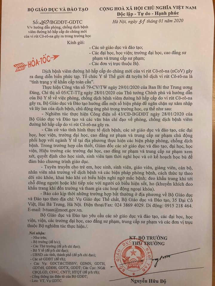 Hôm nay (31/1), Bộ Giáo dục và Đào tạo (GDĐT) đã có công văn hỏa tốc gửi các sở giáo dục và đào tạo, các đại học, học viện, viện, các trường đại học, cao đẳng, trung cấp chuyên nghiệp và các đơn vị trực thuộc Bộ về việc hướng dẫn phòng, chống dịch bệnh viêm đường hô hấp cấp do chủng mới của virus corona gây ra trong trường học.