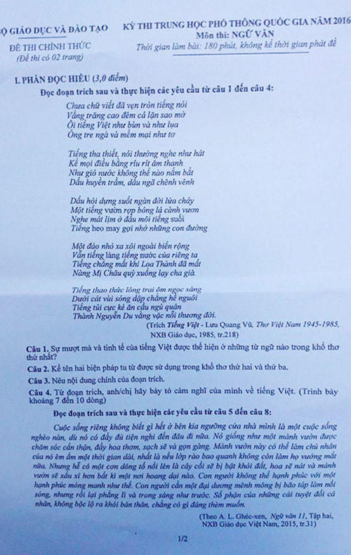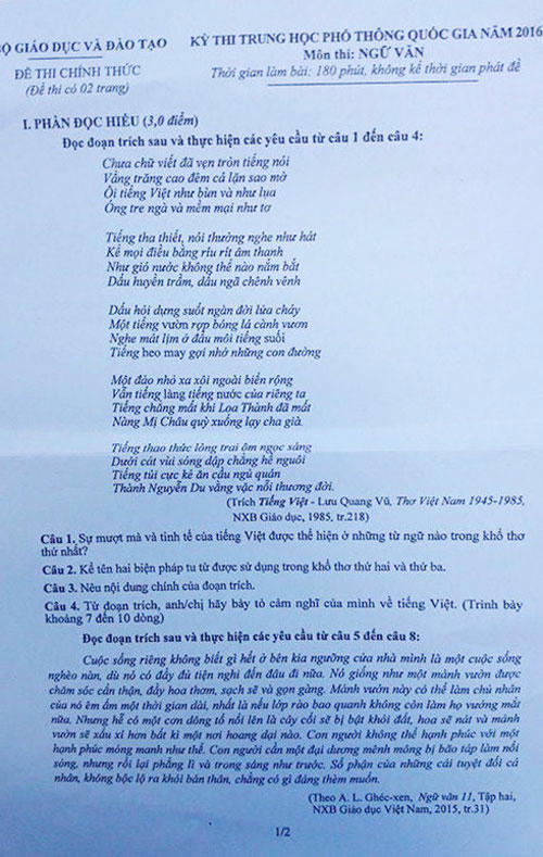 Sau khi đề Ngữ văn được công bố vào buổi sáng nay (2.7), nhiều ý kiến trái chiều của giáo viên, học sinh trên cả nước cho rằng, phần đọc hiểu của đề bài đã trích sai nội dung tác phẩm thơ "Tiếng Việt" của Lưu Quang Vũ.