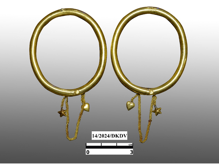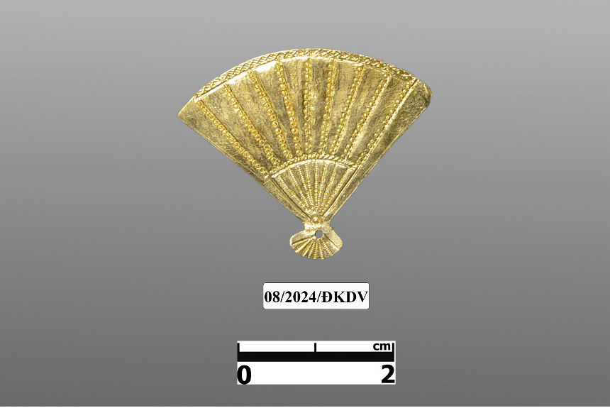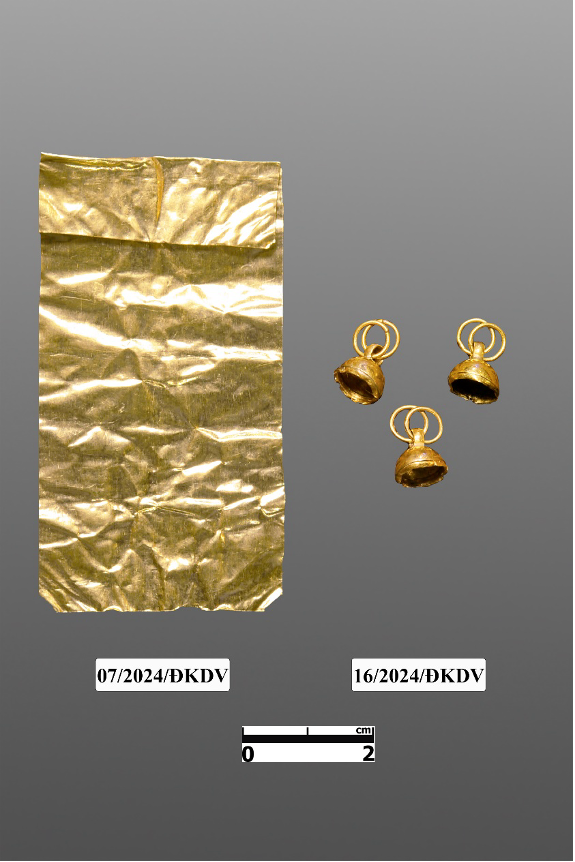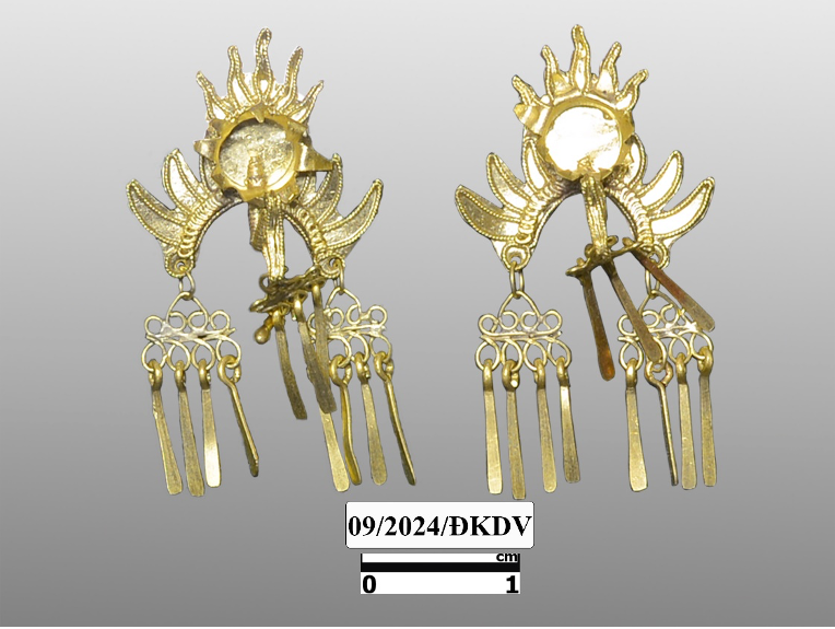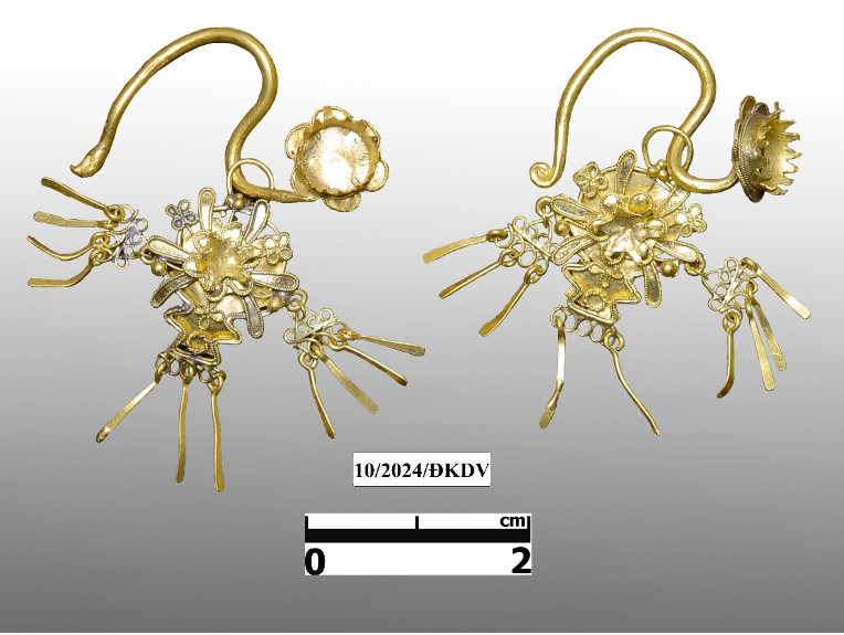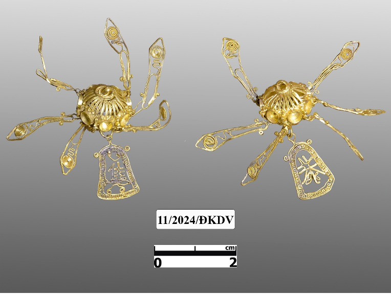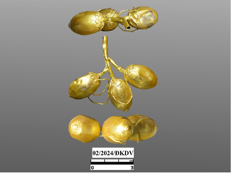TS. Trần Thị Hoàng Mai, Giám đốc Sở Văn hóa-Thể thao TP Hải Phòng cho biết, bộ kim phẩm gồm 16 hiện vật được Thủ tướng Chính phủ công nhận là Bảo vật quốc gia trong dịp đón năm mới 2025 gồm: 1 đôi vòng; 1 lá vàng; 1 thẻ lá trầu, 3 quả cau; 1 chuỗi hạt; 1 quạt; 2 sáp môi; 3 cái cúc; 1 đôi hoàn to; 2 đôi hoàn nhỏ… Tất cả các hiện vật này được chế tác thủ công từ vàng 24K một cách khá công phu, tinh xảo và đang lưu giữ tại Bảo tàng Hải Phòng.