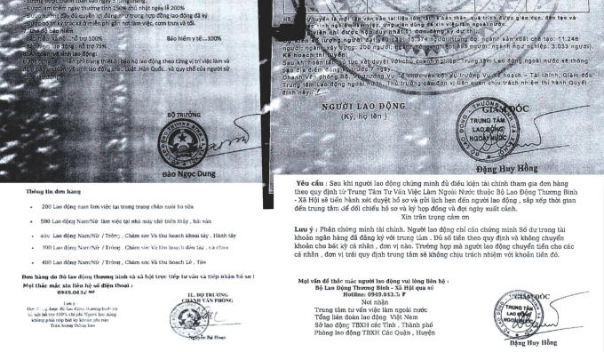 Trong một văn bản giả mạo Trung tâm Lao động ngoài nước với chữ ký giám đốc Đặng Huy Hồng, đối tượng xấu yêu cầu người lao động đóng 60 triệu đồng nhằm "chứng minh tài chính đủ điều kiện tham gia đơn hàng theo quy định" rồi mới được xét duyệt hồ sơ và gửi lịch hẹn ký hợp đồng, đợi ngày xuất cảnh.