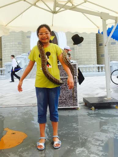 "Mẹ luôn khuyến khích con thử cái mới nếu biết chắc điều đó không nguy hiểm cho con", chị An chia sẻ. Trong ảnh, Chi quấn một chú trăn thật lên cổ trong một chuyến tham quan cùng gia đình.Ảnh:GĐCC. |