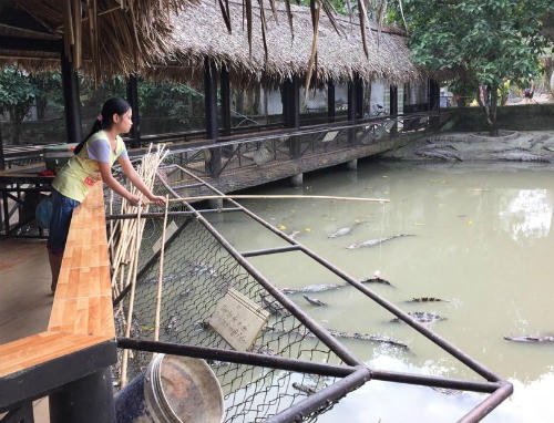 "Câu cá sấu" - một trò nhiều người lớn không dám thực hiện vì sợ nhưngChi dám một mình thử sức khi được mẹ khích lệ. Ảnh:GĐCC. |