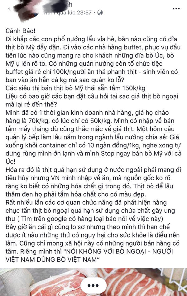 | Thông tin thịt bò mỹ nhập khẩu giá rẻ vì là hàng hết hạn sử dụng đang lan truyền chóng mặt trên mạng xã hội khiến nhiều người hoang mang lo lắng |