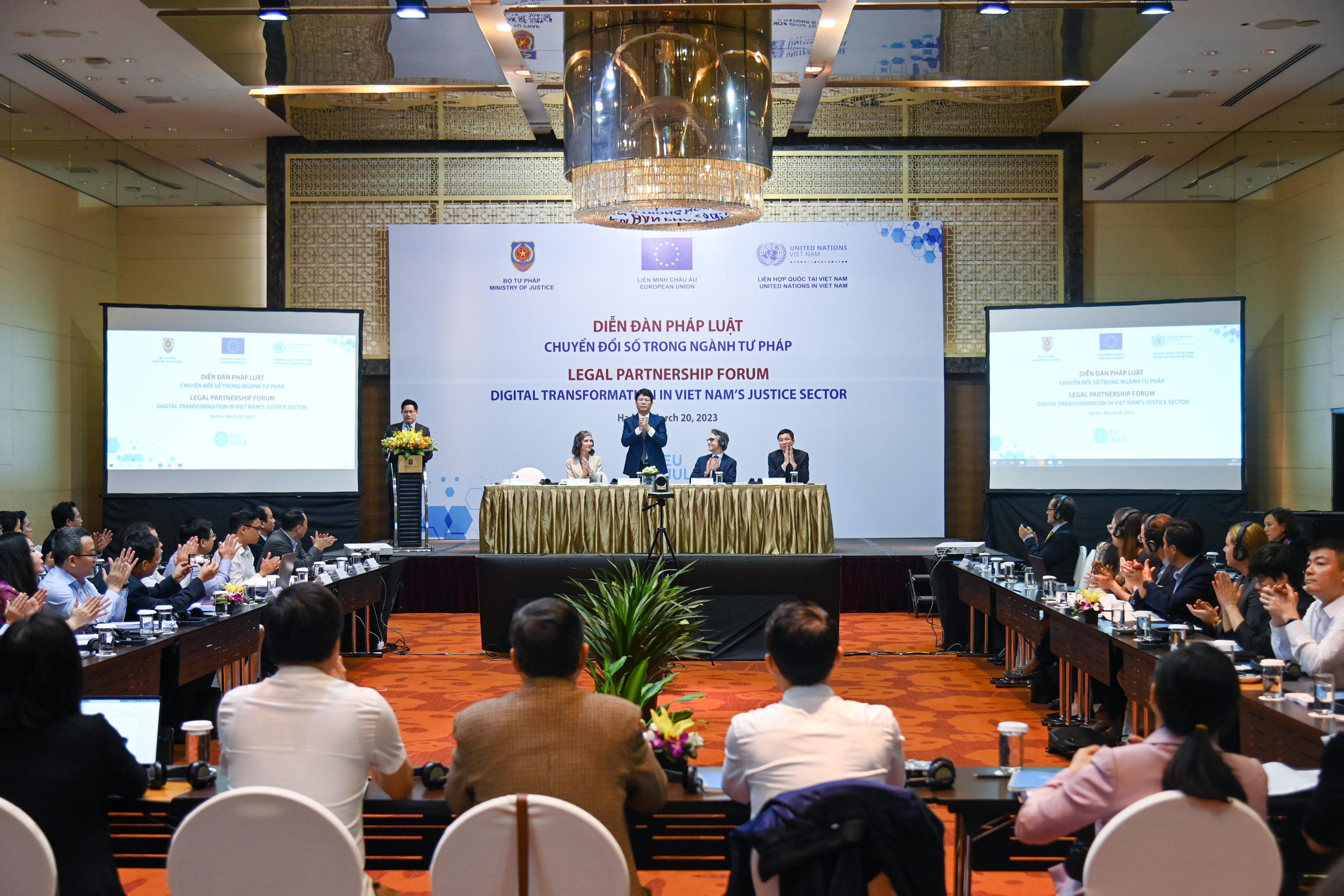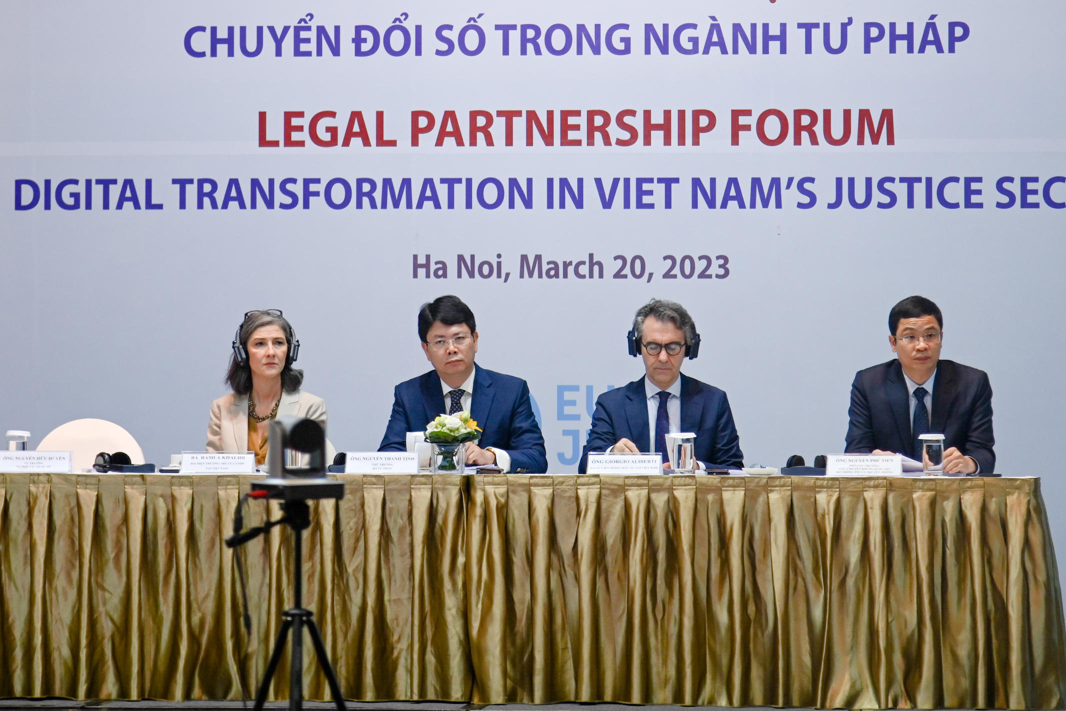 Đồng chủ trì Diễn đàn có ông Nguyễn Thanh Tịnh, Thứ trưởng Bộ Tư pháp; ông Giorgio Aliberty, Đại sứ Liên minh Châu Âu; bà Ramla Khalidi, Trưởng Đại diện thường trú UNDP tại Việt Nam.
