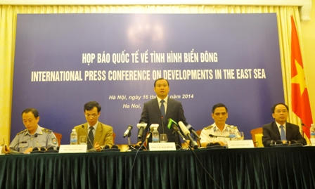 Phát biểu đầu cuộc họp báo, ông Lê Hải Bình, người phát ngôn Bộ Ngoại giao nêu rõ: Xung quanh khu vực hoạt động của giàn khoan, các tàu, máy bay, lực lượng của Trung Quốc vẫn hung hăng đâm va, xua đuổi tàu Việt Nam, tàu các của ngư dân Việt Nam còn bị đâm chìm. Bên cạnh đó, Trung Quốc vẫn liên tiếp đưa ra các luận điểm sai lệch, bị bóp méo về chủ quyền của Việt Nam trên vùng biển.