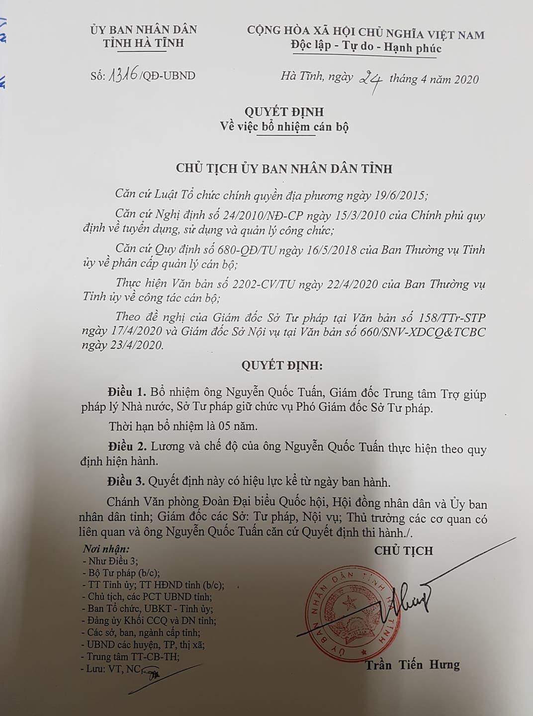 Theo đó, tại Quyết định số 1316 ngày 24/4, Chủ tịch UBND tỉnh Hà Tĩnh đã Quyết định bổ nhiệm ông Nguyễn Quốc Tuấn, Giám đốc Trung tâm Trợ giúp pháp lý Nhà nước Sở Tư Pháp Hà Tĩnh giữ chức vụ Phó giám đốc Sở Tư pháp.