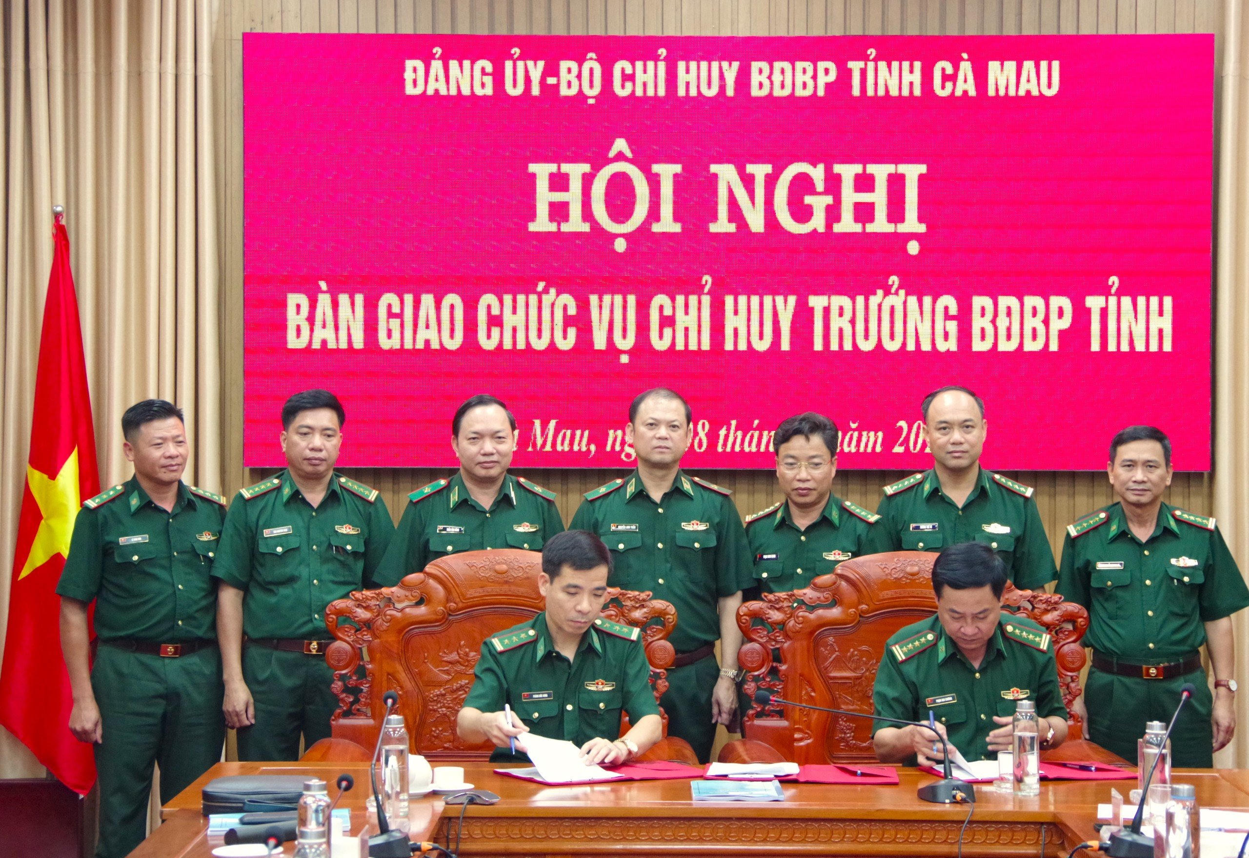 Thượng tá Phùng Đức Hưng (bên trái) và Đại tá Phạm Anh Chương ký biên bản giao nhận Chức vụ Chỉ huy trưởng BĐBP tỉnh Cà Mau. |