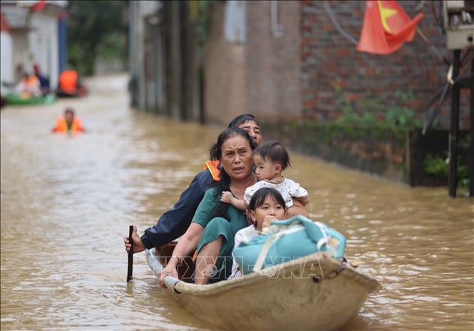 Bà Yến (thôn An Lạc, huyện Sóc Sơn, Hà Nội) cùng các cháu được hỗ trợ di chuyển tới nơi an toàn, ảnh chụp ngày 11/9/2024. Ảnh: Thanh Tùng/TTXVN |