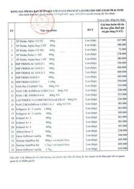 Theo đó, giá bán buôn của các loại sửa được công bố như sau: Dielac Alpha 123HT 167.000 đồng/900g, Dielac Alpha Step 2 HT 188.000 đồng/900g, Firsolac gold1 giá 196.000 đồng/400g, frisolac gold 2 giá 406.000 đồng/900g, Enfagrow A+3 vanilla giá 563.000 đồng/1.8kg, Abbott grow 3 giá 258.000 đồng/900g, Similac loại 900g có giá 405.000 đồng loại 1.7kg có giá 692.000 đồng.