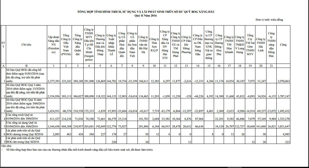 | Bảng báo cáo tổng hợp tình hình trích, sử dụng, và lãi phát sinh trên số dư quỹ BOG xăng dầu quý II năm 2016 |