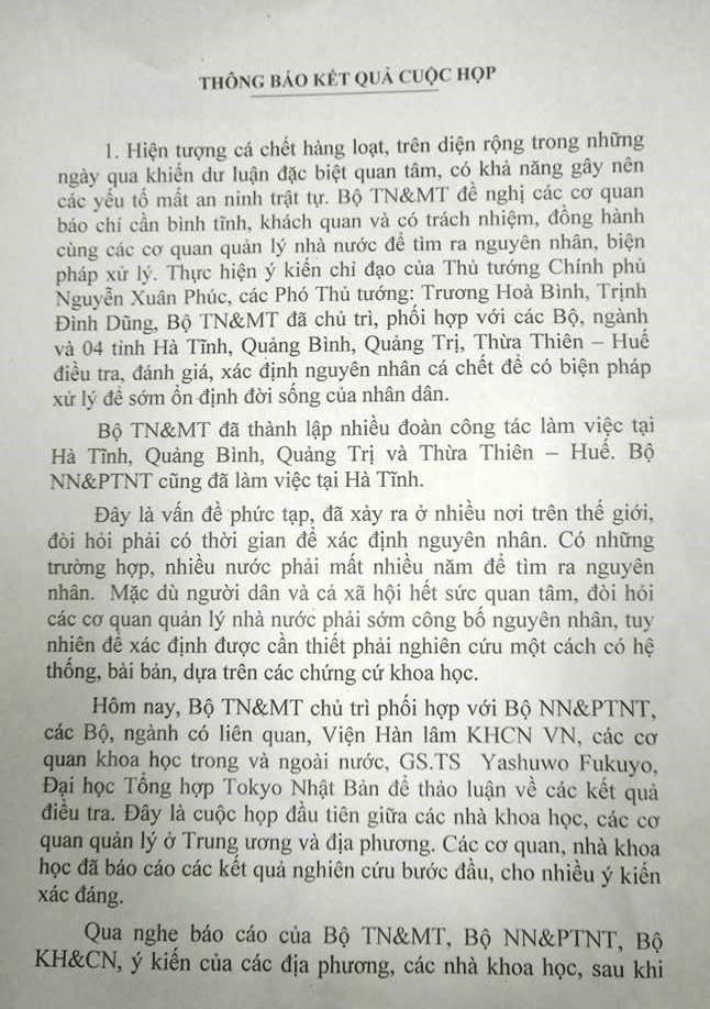 (PLO) - Sau cuộc họp của đại diện nhiều bộ, ngành và chuyên gia nước ngoài, tối nay, 27/4, Thứ trưởng Bộ Tài Nguyên và Môi trường (TN&MT) Võ Tuấn Nhân công bố trước báo giới về nguyên nhân sơ bộ gây hiện tượng cá biển chết hàng loạt ở Bắc miền Trung.