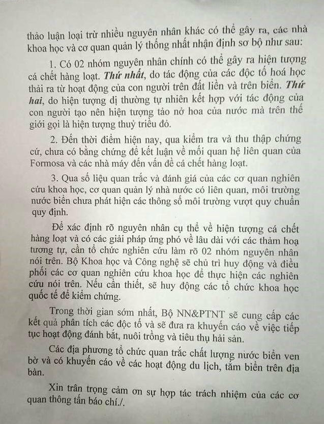 Hai là qua kiểm tra chưa có bằng chứng kết luận mối liên hệ của Formosa Hà Tĩnh đến cá chết hàng loạt. Qua số liệu quan trắc và cơ quan nghiên cứu khoa học, cơ quan quản lý nhà nước có liên quan cung cấp, chưa phát hiện thong số môi trường vượt quy chuẩn quy định.