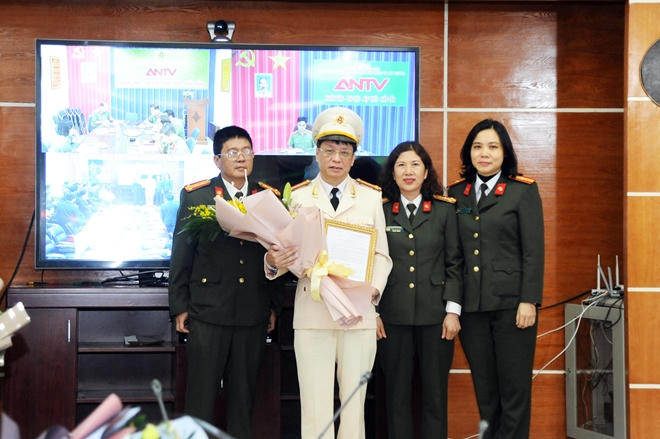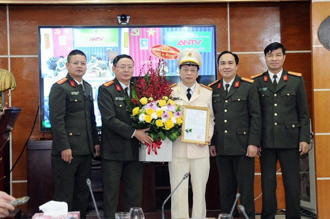 | Lãnh đạo Cục Truyền thông CAND chúc mừng Đại tá Phạm Quang Khải. |