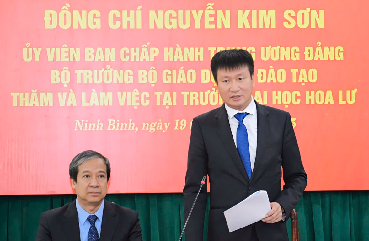 Phát biểu tại buổi làm việc, Chủ tịch UBND tỉnh Ninh Bình Trần Huy Tuấn cảm ơn Bộ trưởng và Đoàn công tác của Bộ Giáo dục và Đào tạo đã về thăm, làm việc với Trường Đại học Hoa Lư. Chủ tịch UBND tỉnh cho biết: Ninh Bình tiếp tục quan tâm đầu tư nguồn lực về cơ sở vật chất đồng bộ, hiện đại; nghiên cứu cơ chế khuyến khích, thu hút nguồn nhân lực chất lượng cao là cán bộ, giáo viên và học sinh, sinh viên về công tác, giảng dạy, học tập tại Trường;… Bên cạnh đó, Chủ tịch UBND tỉnh yêu cầu Trường Đại học Hoa Lư tiếp tục rà soát, nghiên cứu, xác định rõ định hướng phát triển dài hạn theo định hướng của Bộ Giáo dục và Đào tạo, Nghị quyết Đại hội Đảng bộ tỉnh lần thứ nhất, nhiệm kỳ 2025-2030 và các định hướng phát triển giáo dục đại học của tỉnh; phát huy tối đa tiềm năng, thế mạnh để nâng cao năng lực cạnh tranh trong đào tạo các ngành nghề hệ sư phạm, ngoài các ngành sư phạm truyền thống, mở rộng sang đào tạo giáo viên với các môn học đang cần như: Tin học, Mỹ thuật…; đẩy mạnh nghiên cứu khoa học, không ngừng nâng cao chất lượng giáo dục để xây dựng, phát triển Trường Đại học Hoa Lư xứng đáng là cơ sở đào tạo nguồn nhân lực chất lượng cao cho tỉnh Ninh Bình và cả nước.