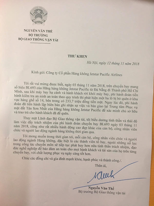 (PLO) - Bộ trưởng Bộ Giao thông Vận tải Nguyễn Văn Thể vừa có thư khen phi hành đoàn Hãng hàng không Jetstar Pacific vì đã có hành động cao đẹp, góp phần truyền tải tinh thần người tốt việc tốt khi phát hiện và trả lại trên 230 triệu đồng cho hành khách bỏ quên trên máy bay.